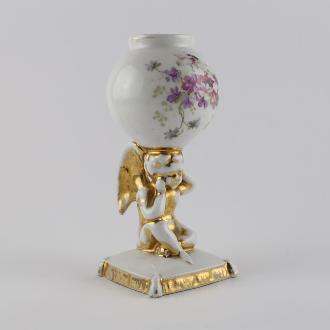 Mate en porcelana isabelina decorada «flores». Pie esculturado «ángel» con destaques en oro. Alto 16.5 cm.