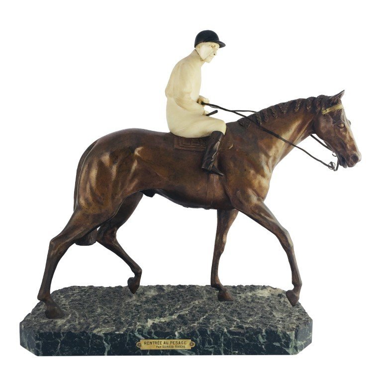 GUIRAUD-RIVIÈRE, Maurice (escuela francesa, 1881-1947). Escultura ecuestre. “Rentrée au pesage.” Caballo en bronce pátina marrón. Jockey en mármol, con cabeza y manos en marfil tallado. Botas, gorra y fusta en bronce. Base en granito verde. 40 x 40 x 17 cm.
