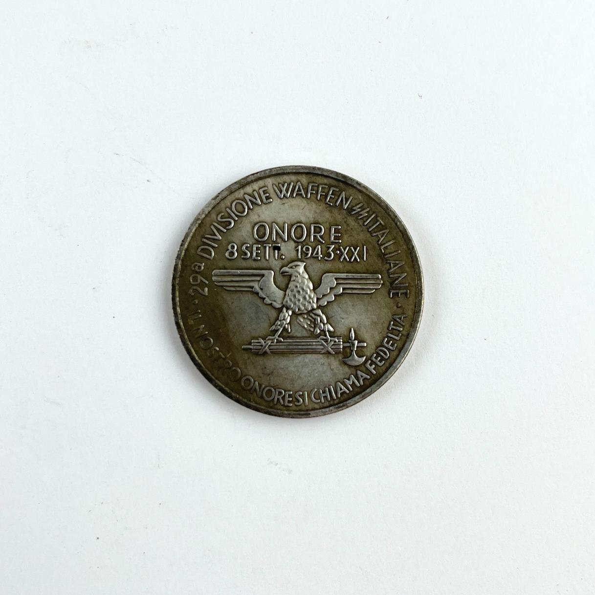 Medalla alemana época nacionalsocialista en metal blanco otorgada a los miembros del 29 batallón de la División Italiana de la Waffen SS en 1944.