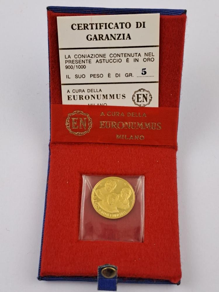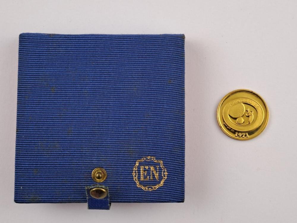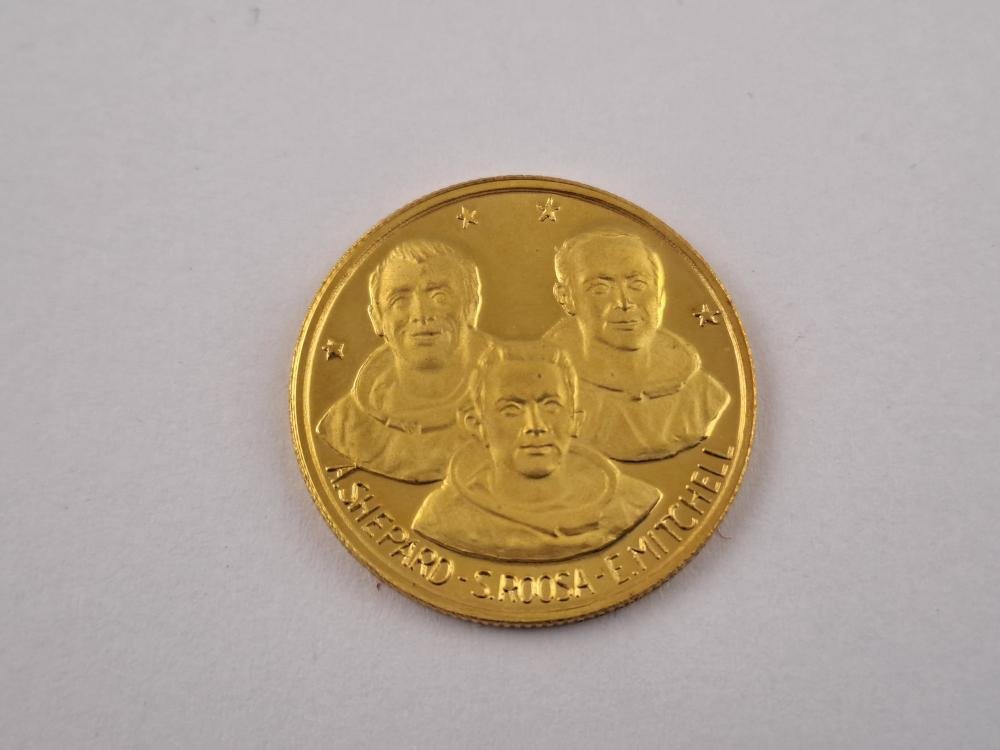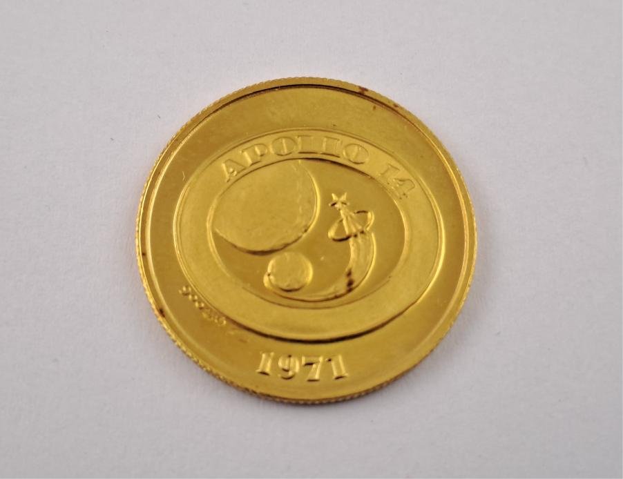 Medalla en oro 900 “Apollo 14 1971” con inscripción “A. Sheppard S. Rossa E. Mitchel.”. Acuñada por Euronummus, en estuche original con certificado. Peso: 5 gr aprox.