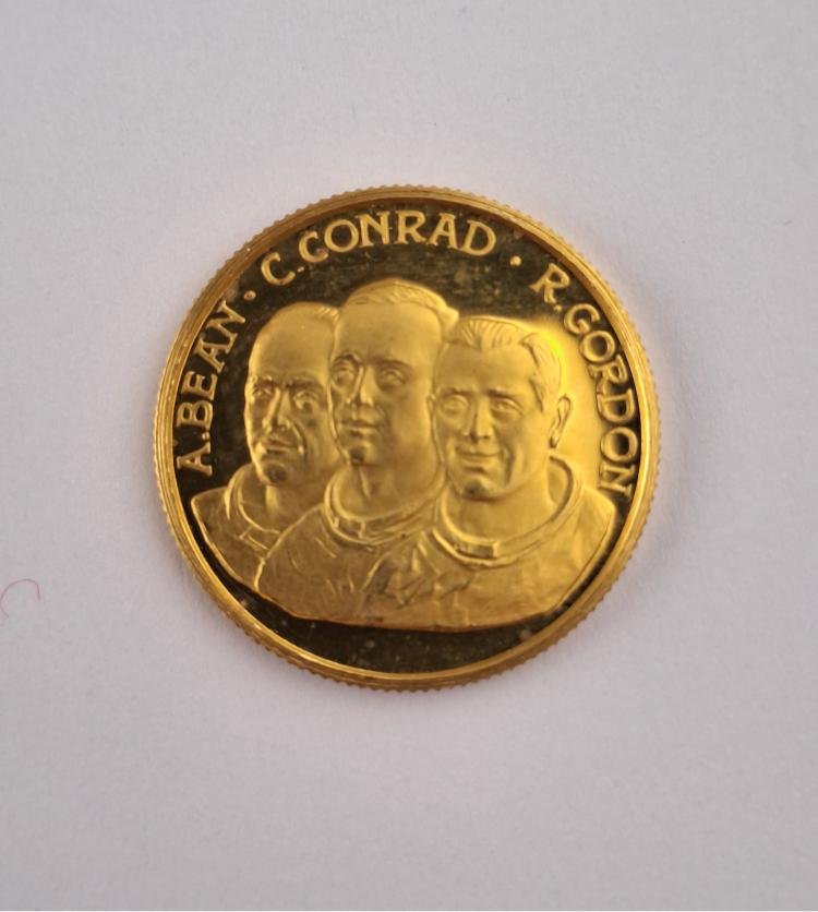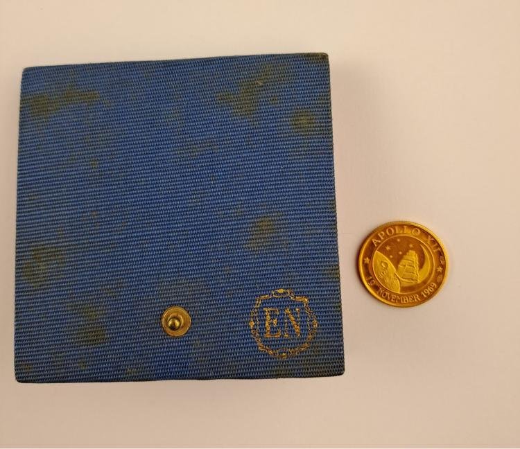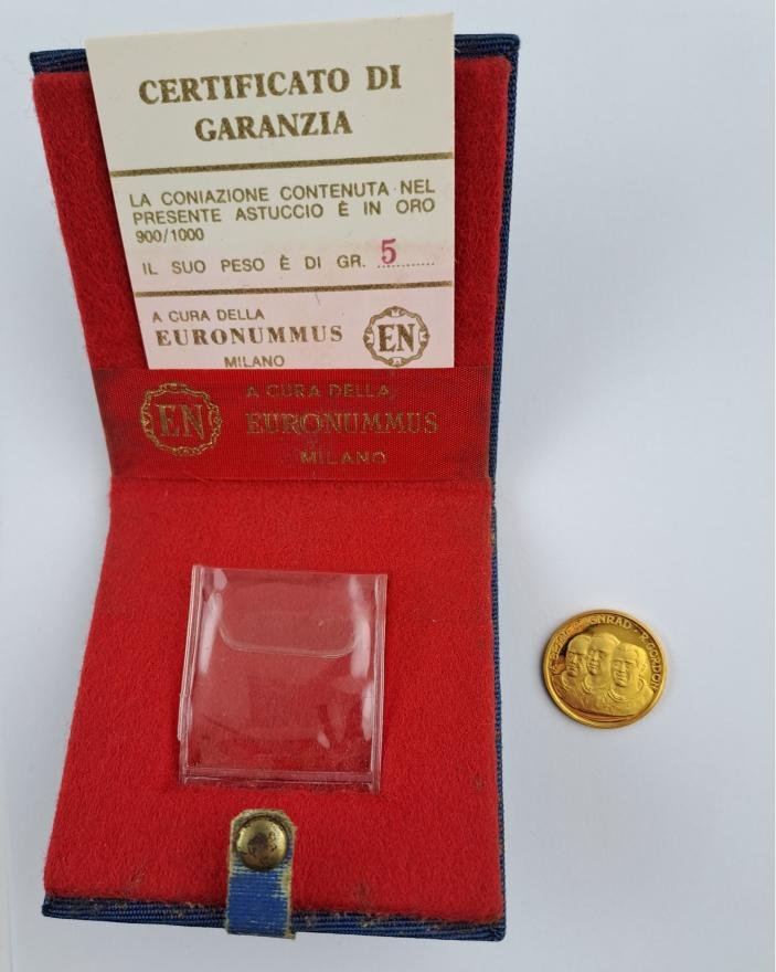 Medalla en oro 900 “Apollo XII 1969” con inscripción “A. Bean, C Conrad, R Gordon”. Acuñada por Euronummus, en estuche original. Peso: 5 gr aprox.
