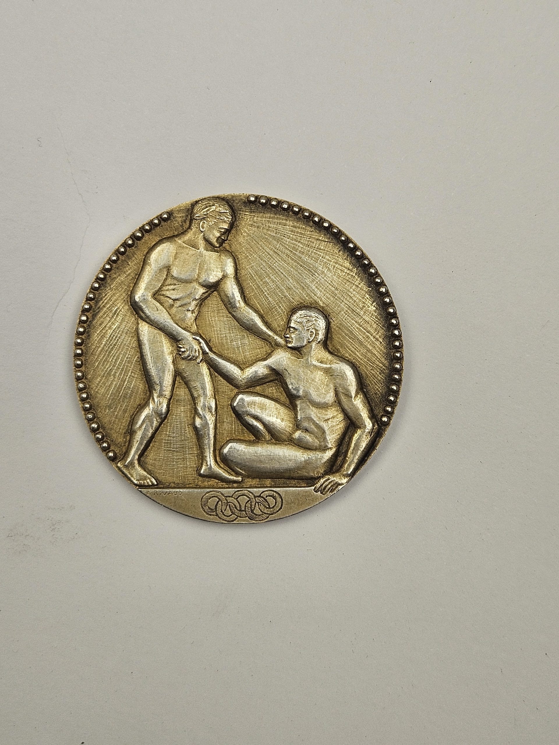 Medalla de oro otorgada a los campeones olímpicos en París en 1924, diseñada por André Rivaud. Anverso: inscripción «VIIIeme Olympiade París 1924» y alegoría de los juegos olímpicos. Reverso: efigies de campeón olímpico desnudo ayudando a su oponente a levantarse del suelo, sobre cinco aros olímpicos. A la izquierda firma del artista. Canto marcado «2ARGENT». Durante los juegos olímpicos de 1924 fueron creadas 304 medallas de oro, 304 de plata y 306 de bronce. Esta medalla de oro olímpica fue originalmente realizada en plata con baño de oro. Medidas: diámetro 55 mm – alto 5 mm. Peso 80 gr. Otorgada a Domingo Etchegoyhen jugador de la selección uruguaya de fútbol que pertenecia al club Liverpool de Montevideo en ese momento.