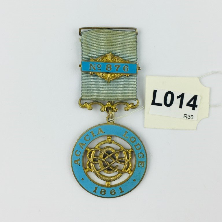 Medalla de pecho masónica uruguaya en plata vermeil inglesa de Londres año 1961 con detalles en esmalte y cinta color celeste, perteneciente a la logia Acacia de Montevideo, fundada en 1861, No. 876.