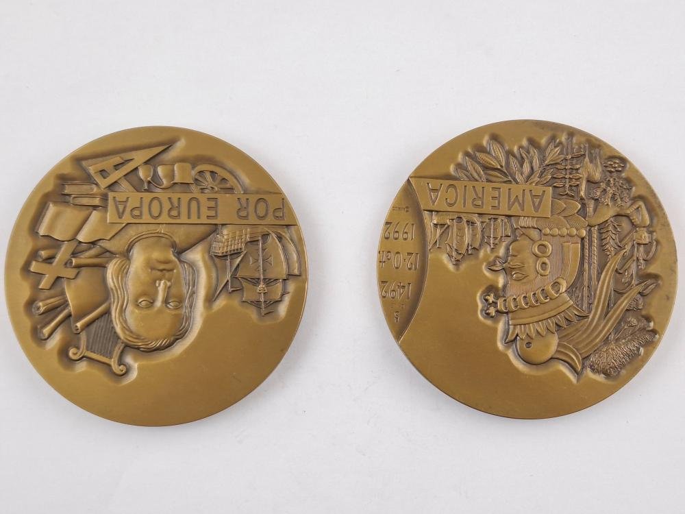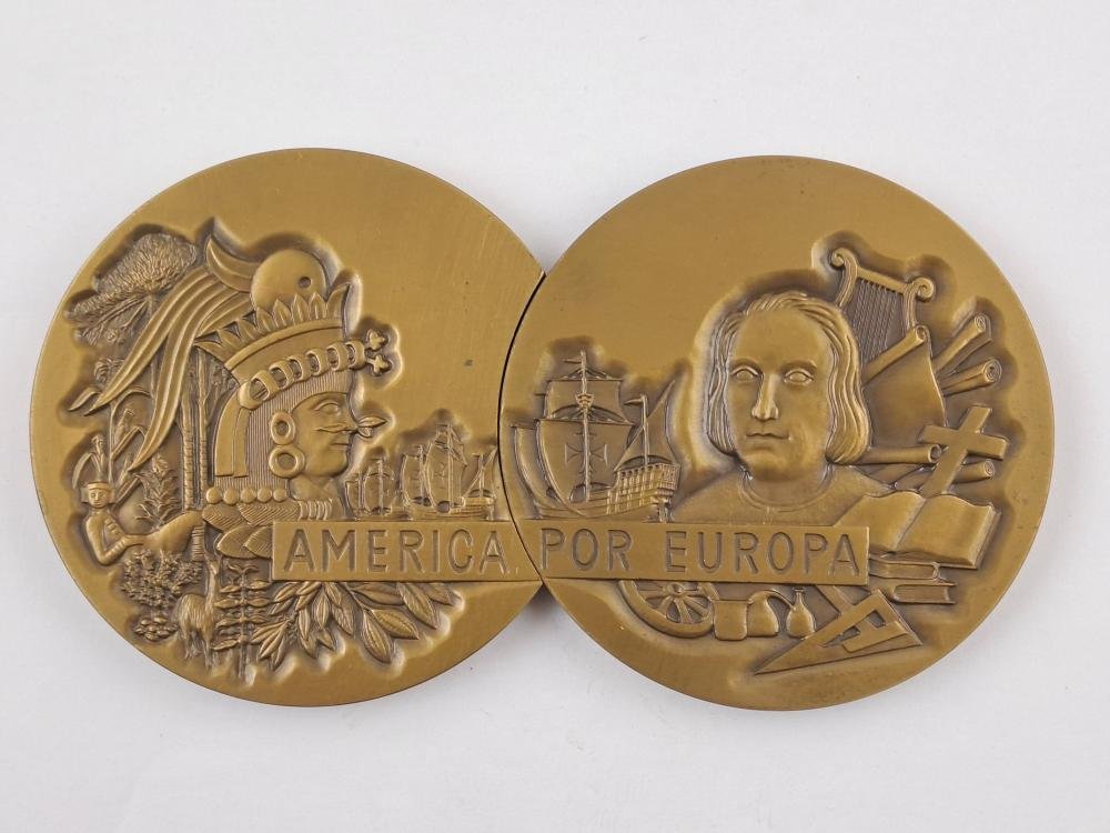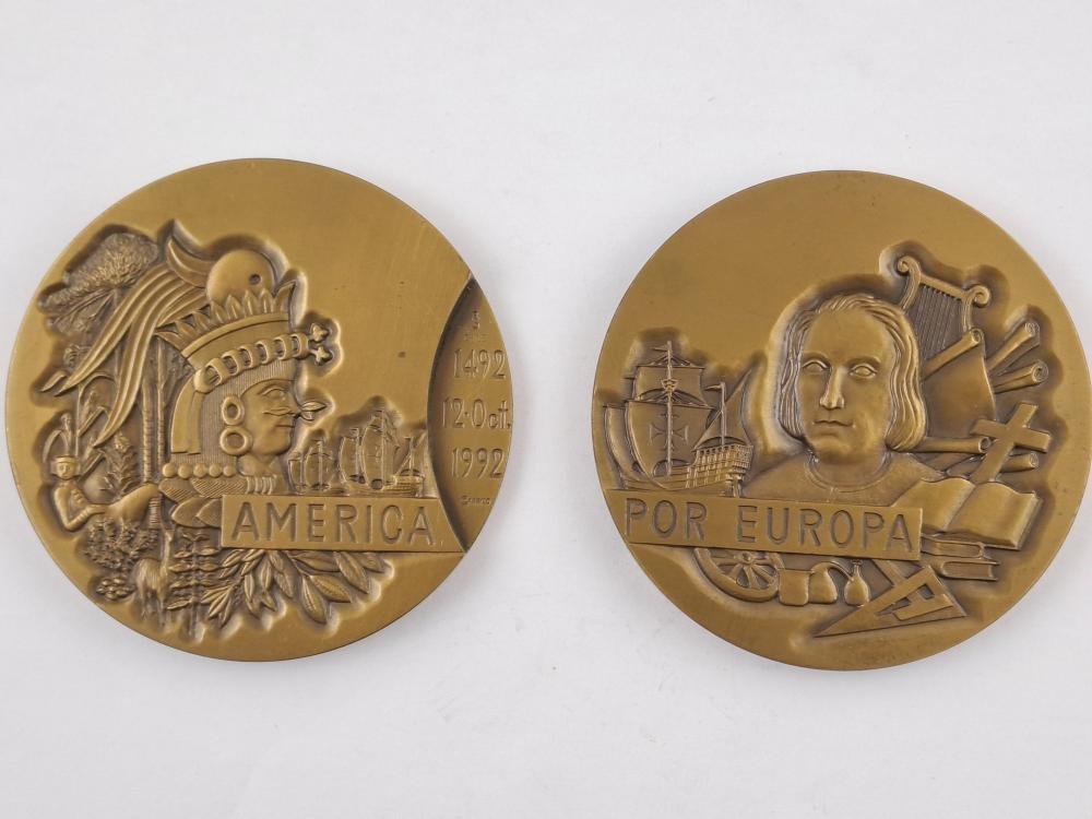 Medalla doble: América por Europa 1492 12 oct 1992, 500 años del descubrimiento de América. Sellada con el nombre del artista (Carlos) Carrizo, de bronce, 7 cm de diámetro y se encastran en la muesca formando una sola de 13 cm de largo. La casa de la moneda de Santiago de Chile