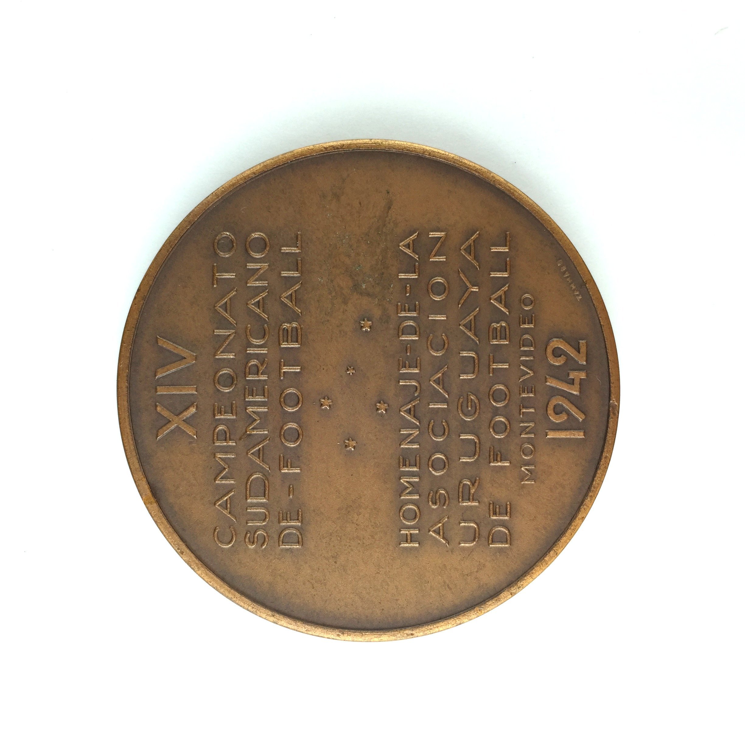 Medalla en bronce realizada en 1942 por la AUF en homenaje al XIV Campeonato Sudamericano de Fútbol. «América cumplirá su destino.» Realizada por Tammaro.