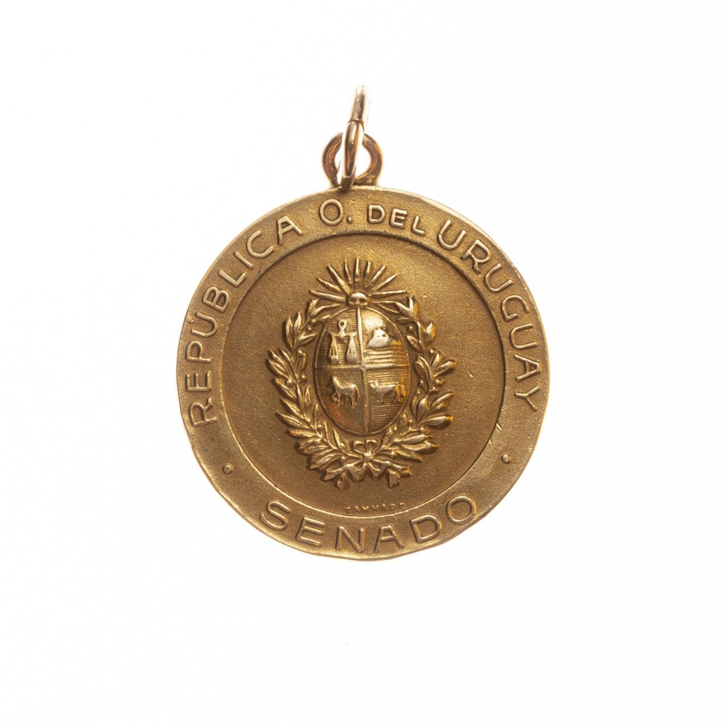Medalla oro 18 K amarillo otorgada por el senado de la República Oriental del Uruguay al senador Dr. Raúl del Campo Aprile, perteneciente al período 1959-1963, con nombre del senador en esmalte azul. Diámetro 27 mm. Peso 17,3 gr.