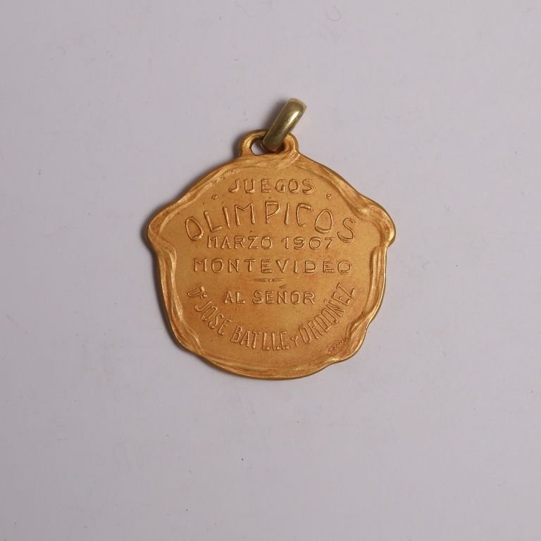 Medalla en oro 18 K amarillo conmemorativa de los Juegos Olímpicos realizados en Montevideo en 1907. Diámetro 42 mm. Peso 41 gr.