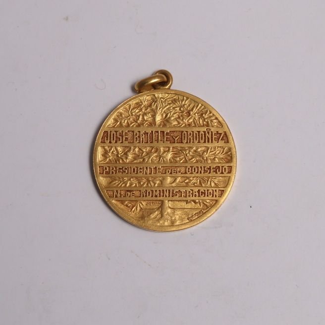Medalla en oro 18 K amarillo otorgada a Jose Batlle y Ordoñez en su calidad de presidente del Consejo Nacional de Administración por el Banco de la República Oriental del Uruguay en ocasión de su XXV aniversario. Diámetro 33 mm. Peso 27 gr.