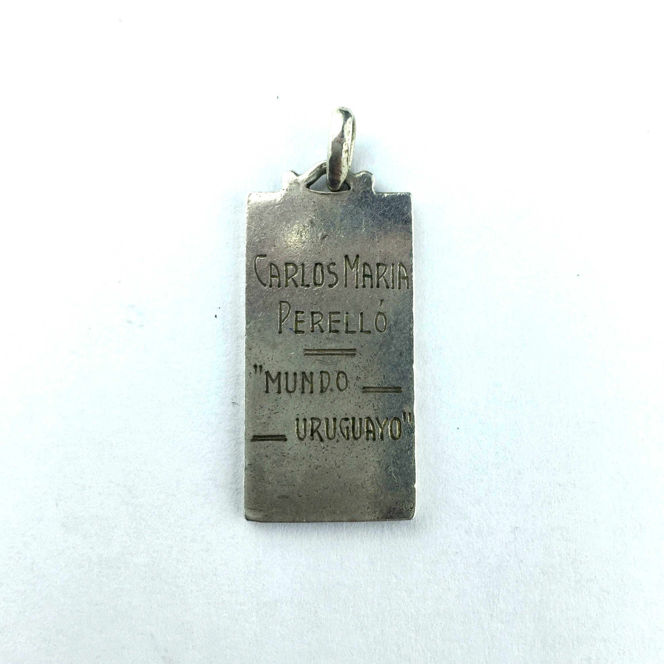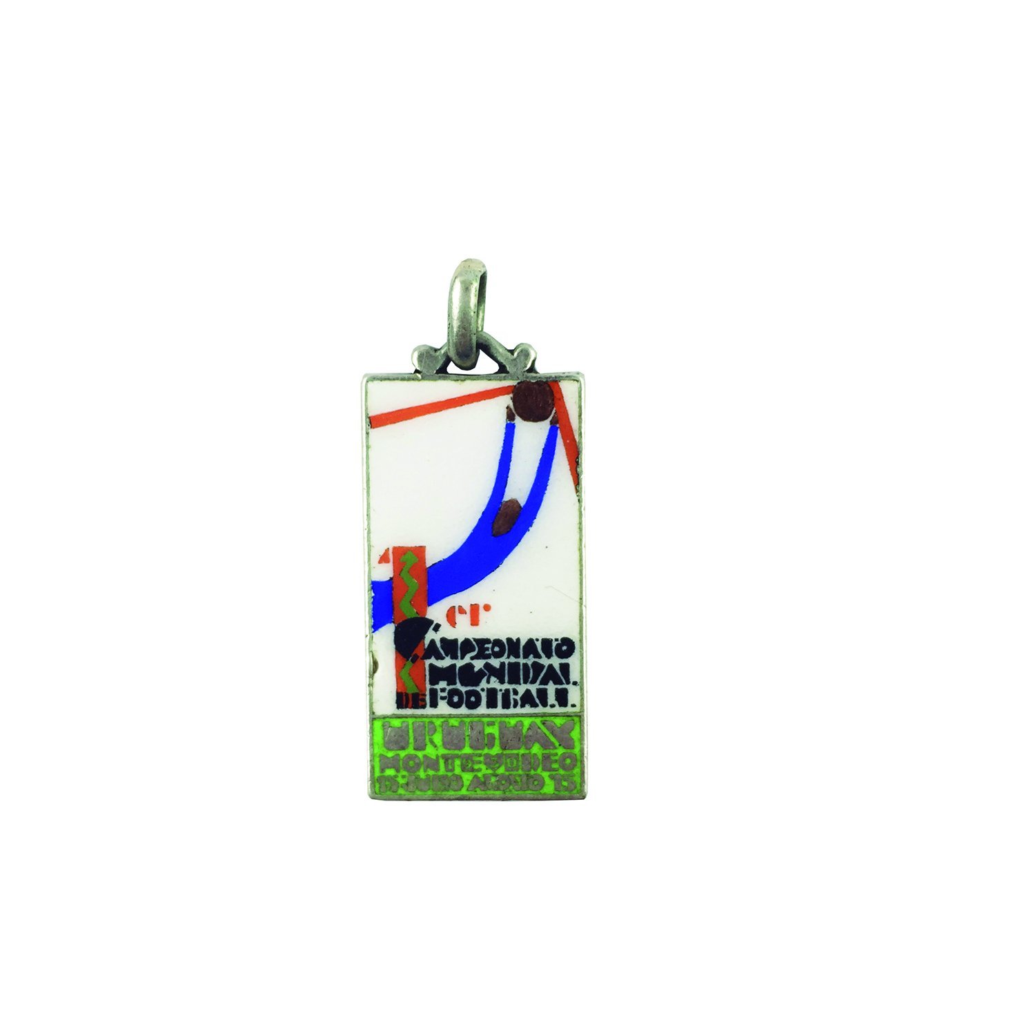 Medalla en plata esmaltada reproducción en miniatura del afiche oficial «1er Campeonato mundial de Football» diseñado por Guillermo Laborde.