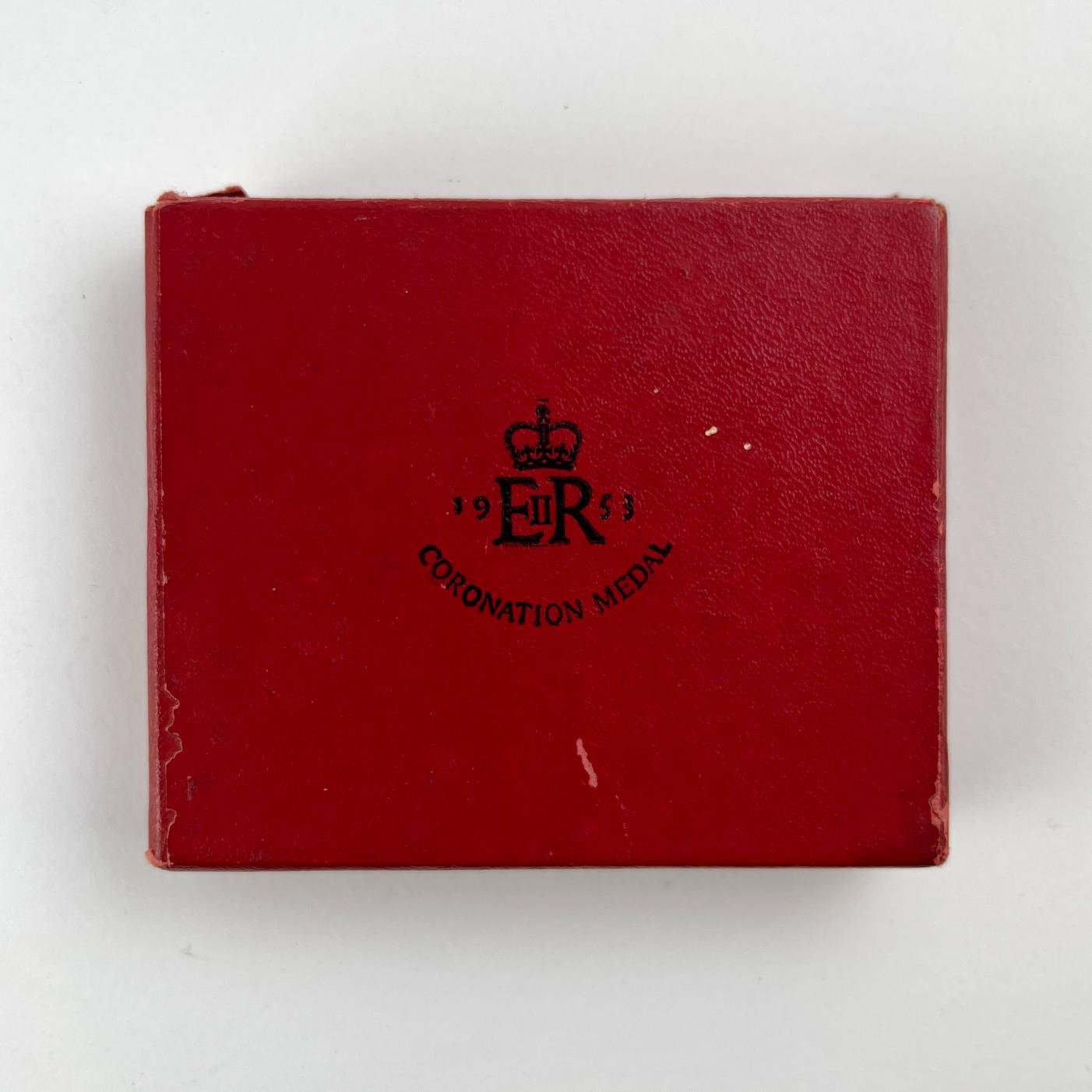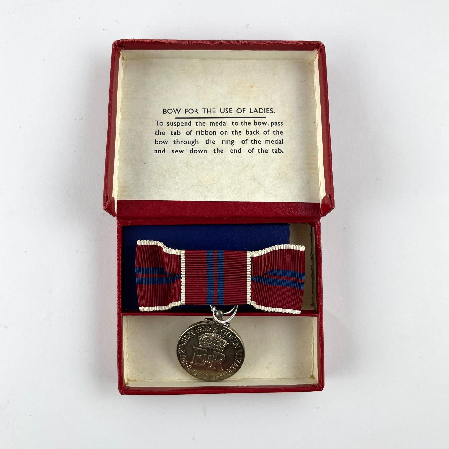 Medalla de la Coronación de la Reina Isabel II, 1953, en metal plateado con cinta. En su estuche original.