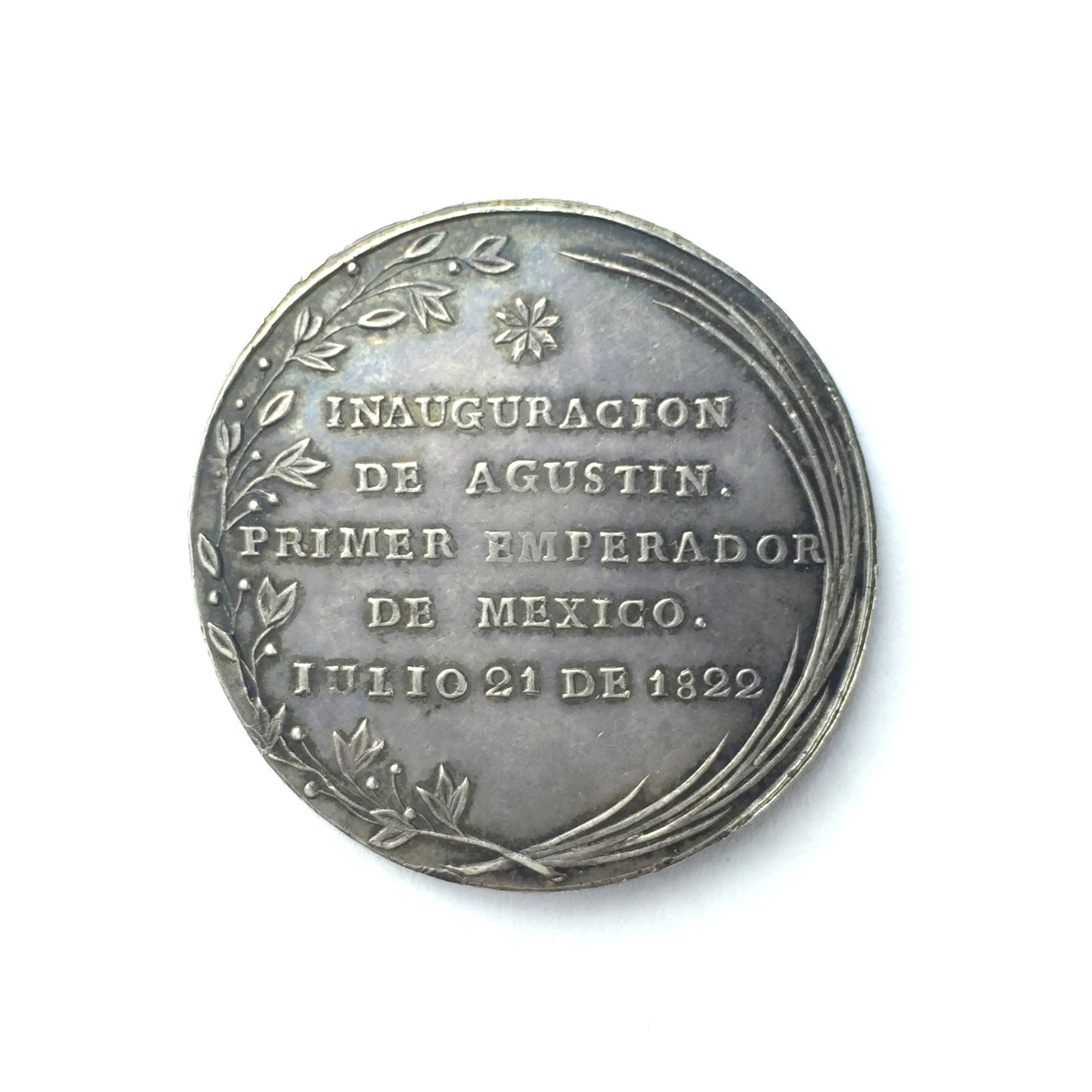Medalla mexicana en plata. «Inauguración de Agustín, primer emperador de México, julio 21 de 1822». Diámetro 34 mm. Peso 17 gr.