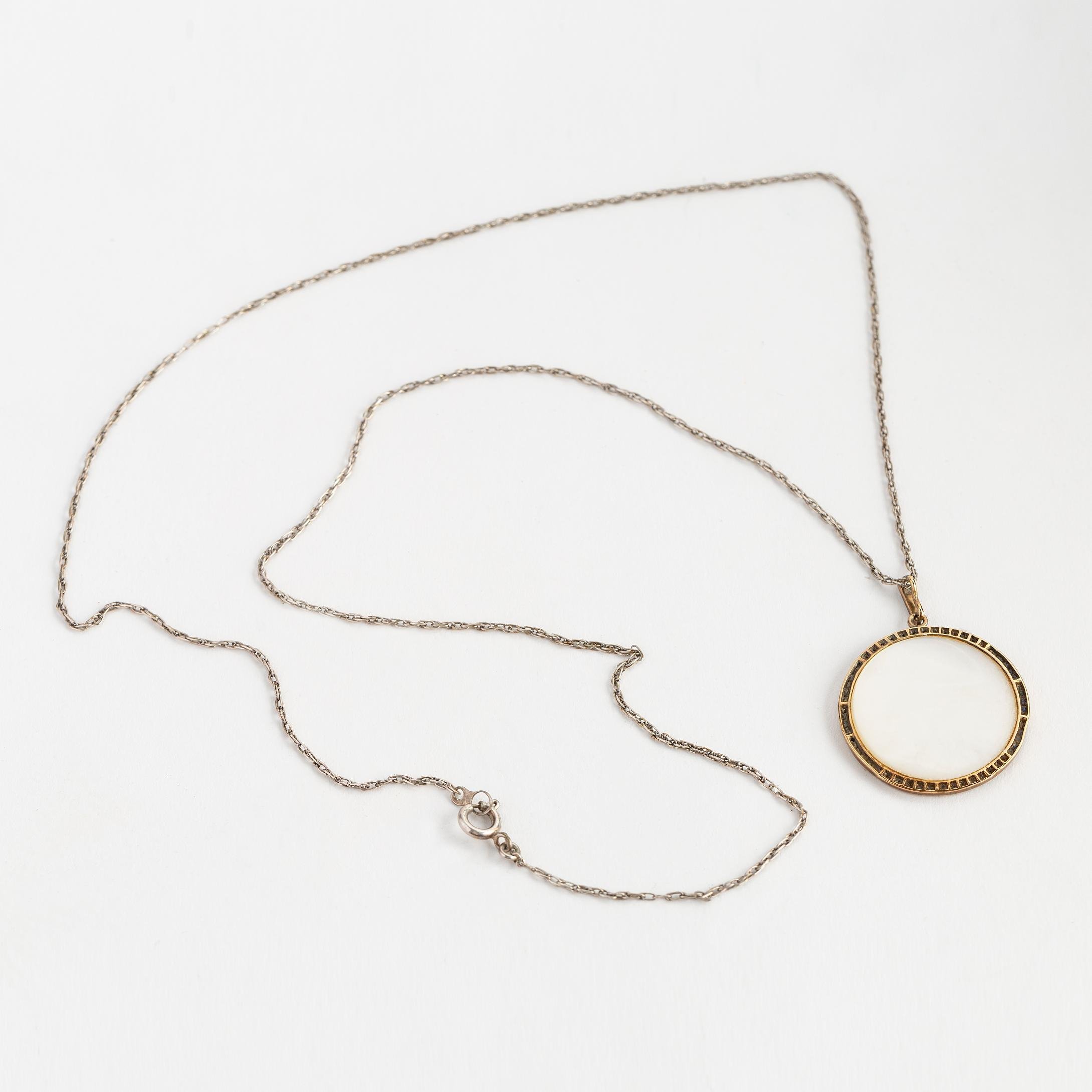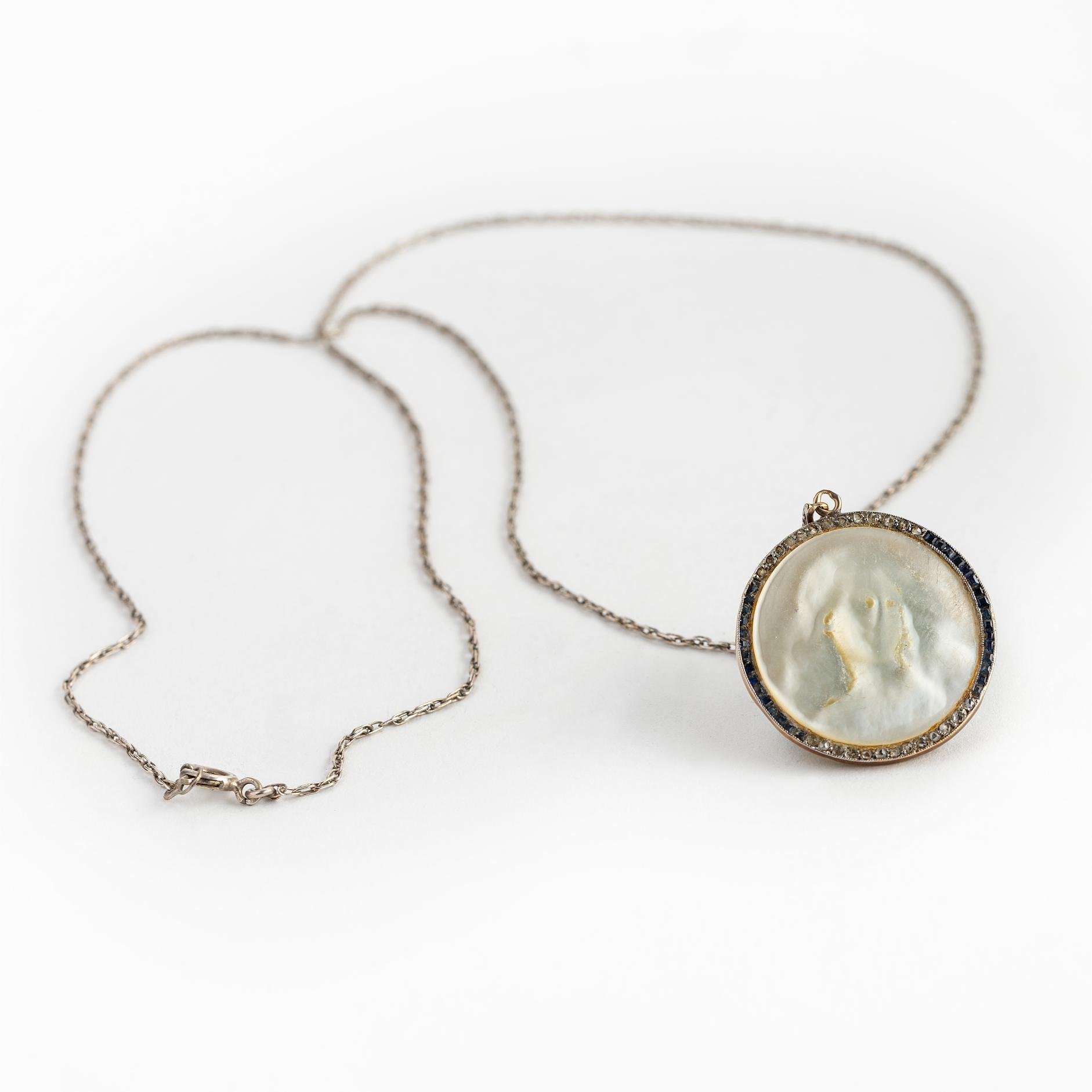 Medalla en nácar tallado con marco en oro blanco y amarillo decorado con zafiros y diamantes. Diámetro 28 mm. Con cadena en plata.
