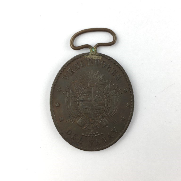 Medalla uruguaya época Guerra del Paraguay, en cobre. «Vencedores de Yatay. 17 de agosto 1865». Variable con doce balas de cañón. Gancho restaurado.