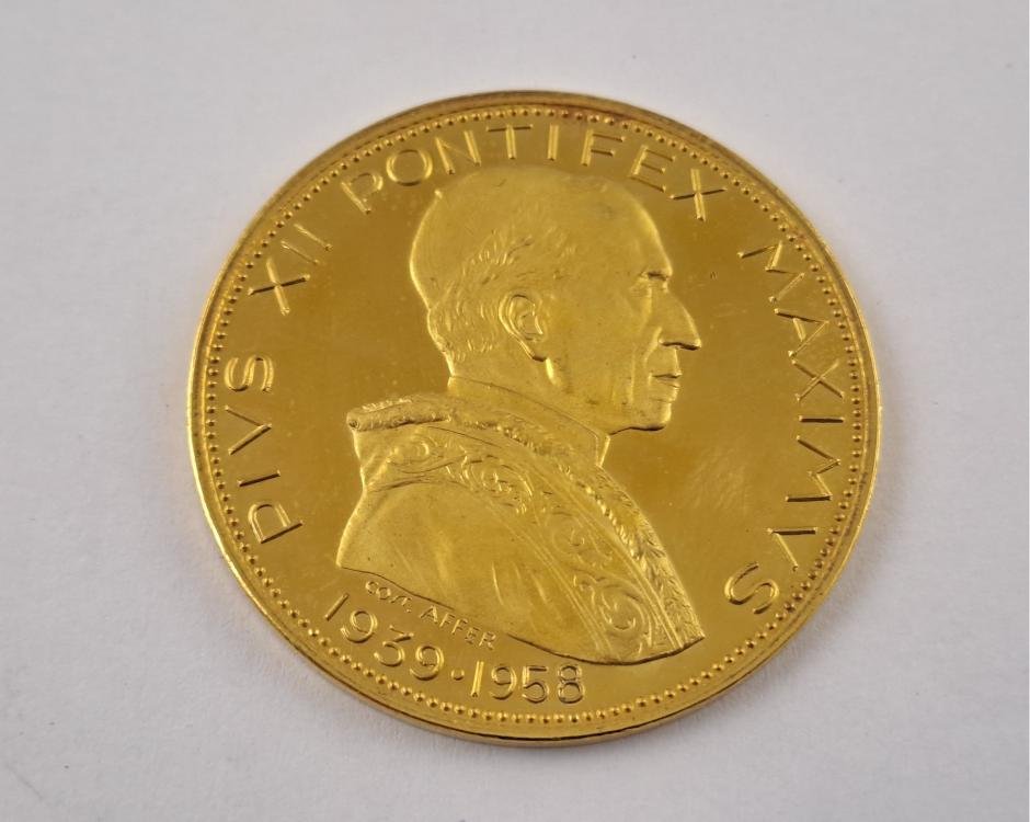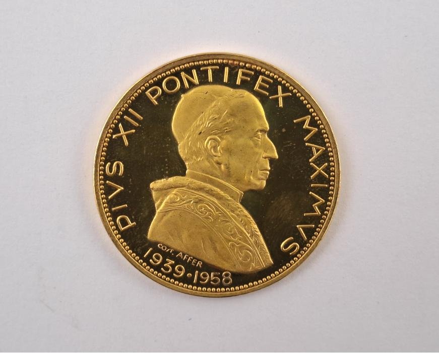 Medalla vaticana en oro 900, Pío XII (1939-1958) con inscripción “Corpore et anima in coelum assumpta”. Peso 22 gr aprox.