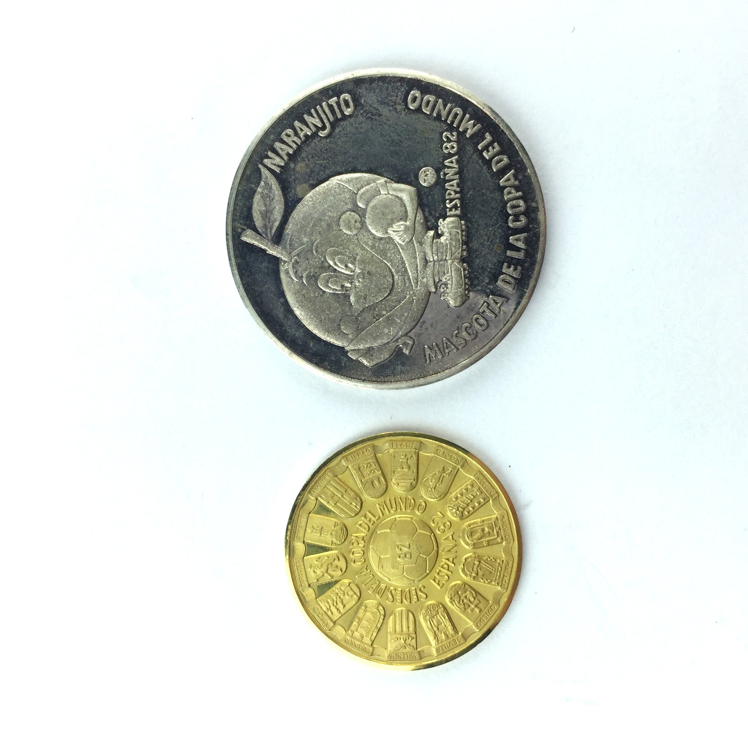 Dos medallas conmemorativas del Campeonato Mundial de fútbol España 1982. Una dorada, diámetro 24 mm, en estuche original. Otra plateada, diámetro 32 mm.