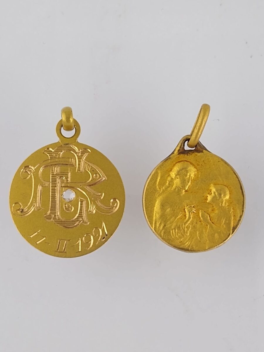 Dos pequeñas medallas, una en oro 18 K amarillo (peso 2 gr) y otra enchapada en oro.