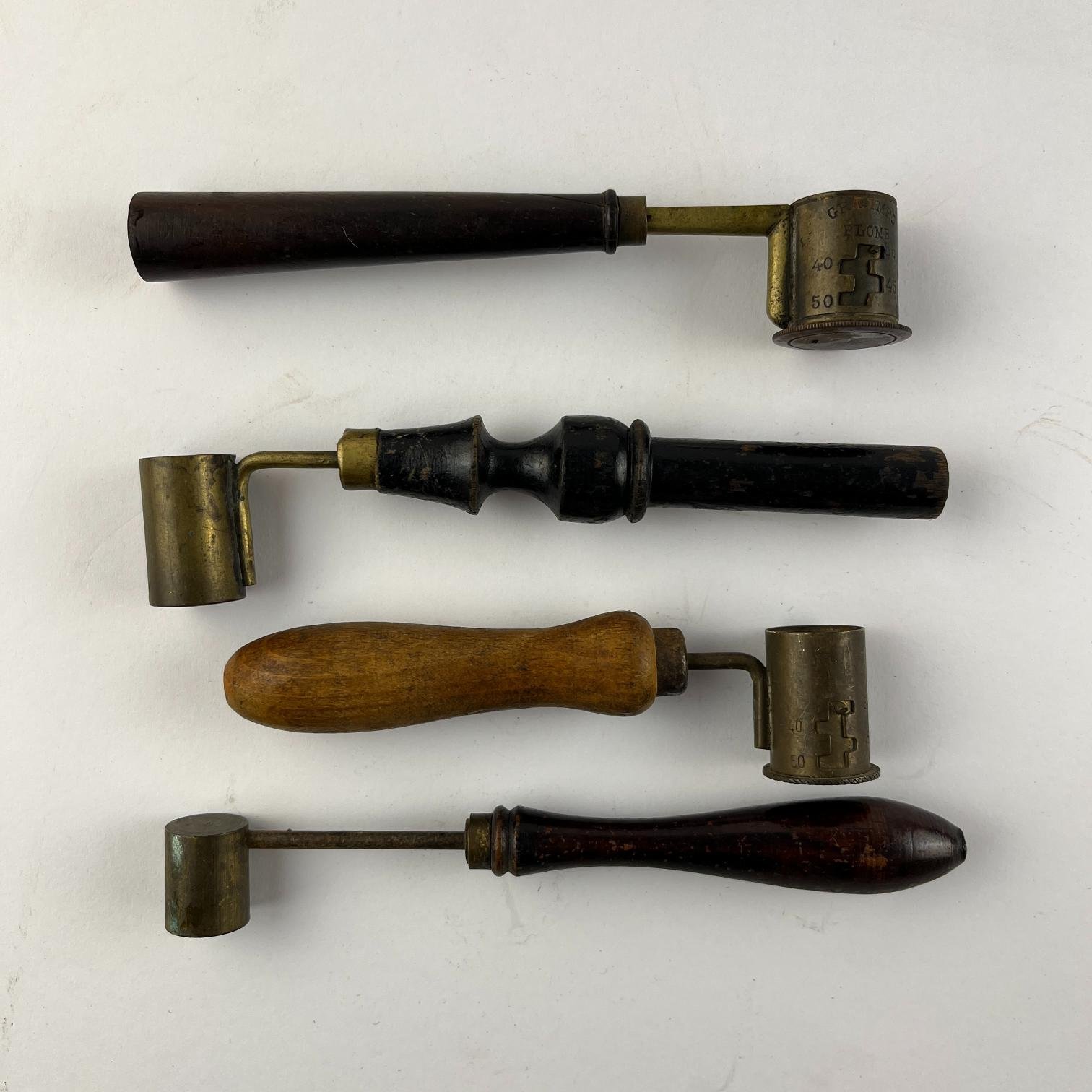 Cuatro medidas para pólvora, en bronce con cabos en madera.