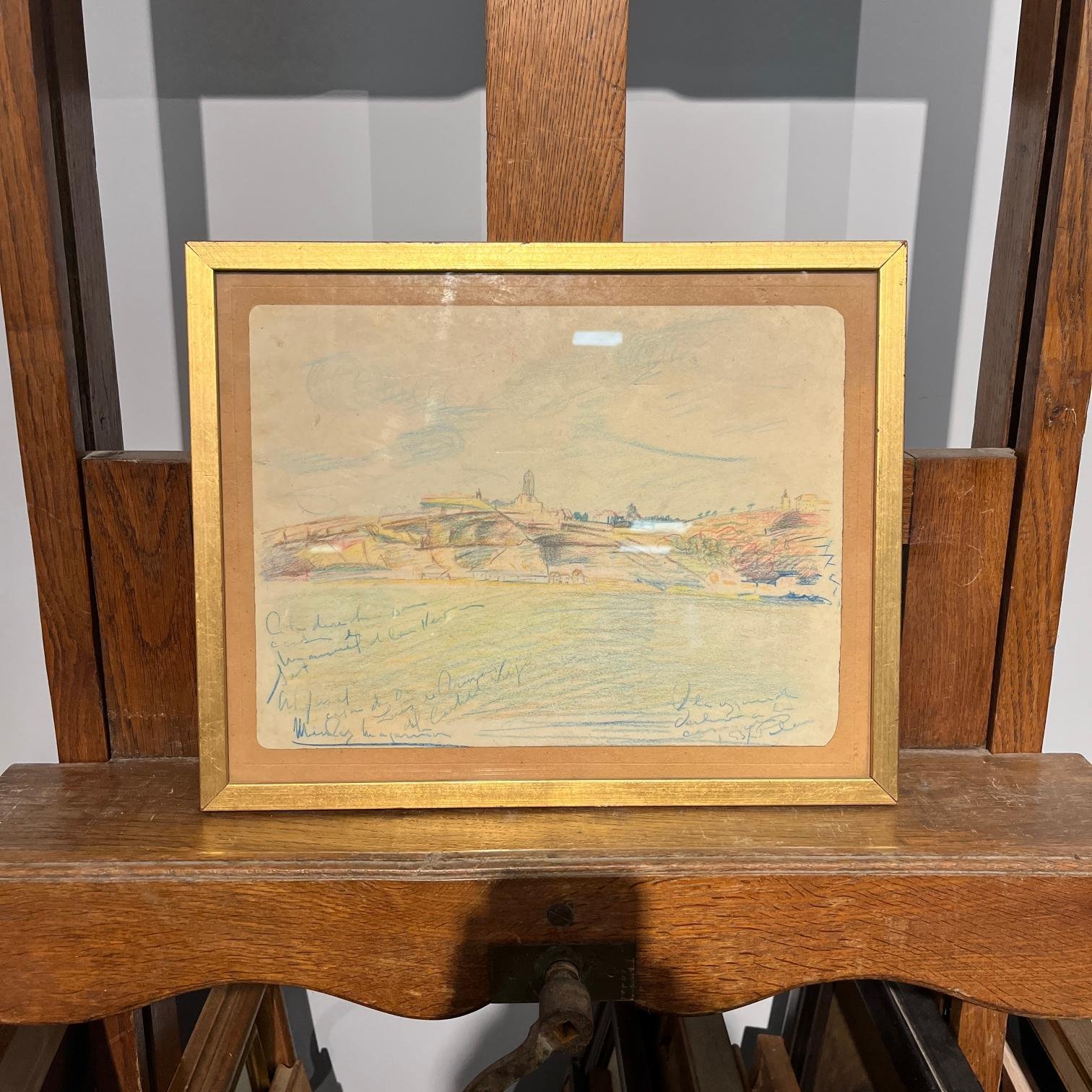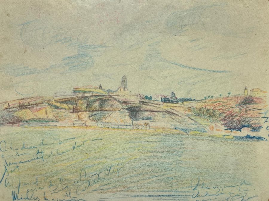 MELCHOR MÉNDEZ MAGARIÑOS (Escuela uruguaya, 1885-1945) Lápiz sobre papel «Pueblo a la distancia» Firmado abajo a la izquierda Fechado «1937» abajo a la derecha 32 x 24 cm