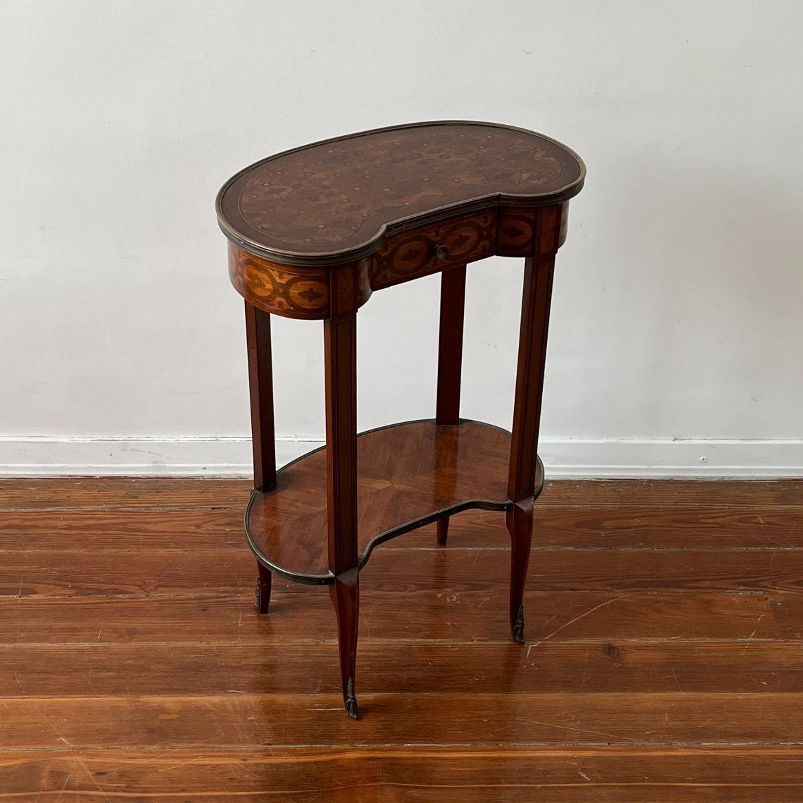 Mesa auxiliar francesa tipo riñón decorada en marqueterie en diferentes maderas. Un cajón y monturas en bronce. 74 x 47 x 28 cm.