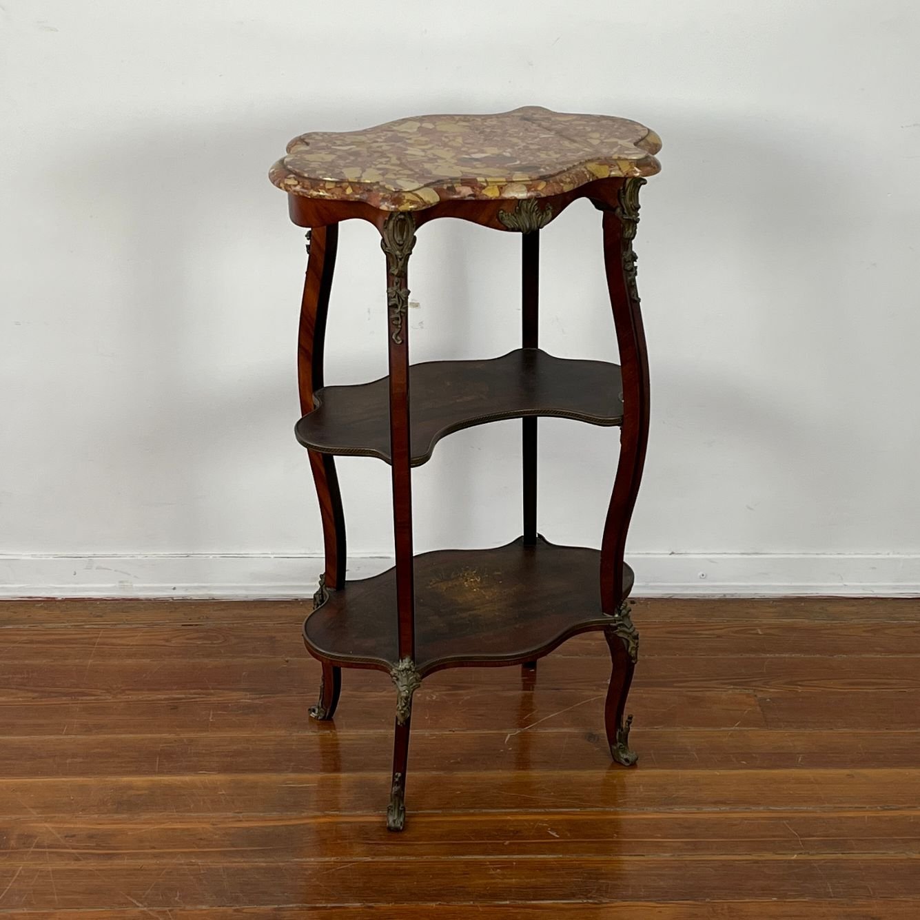 Mesa auxiliar estilo Luis XV enchapada en palo de rosa, con monturas en bronce cincelado. Dos estantes pintados a mano «paisajes». Tapa en mármol veteado. 89 x 35 x 54 cm.