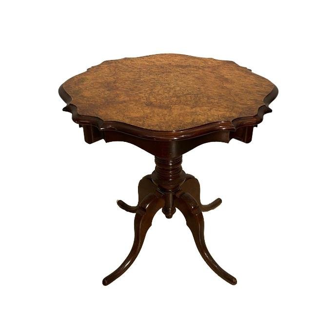 Mesa auxiliar estilo inglés en caoba con tapa enchapada en raíz de nogal. Pie central de cuatro patas. 58 x 60 cm.