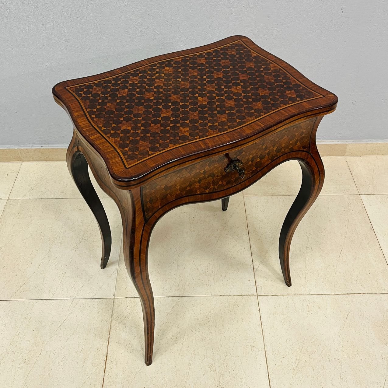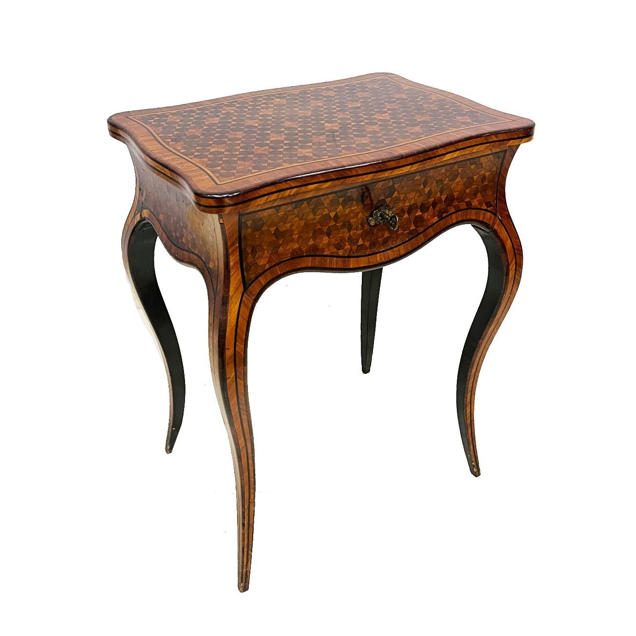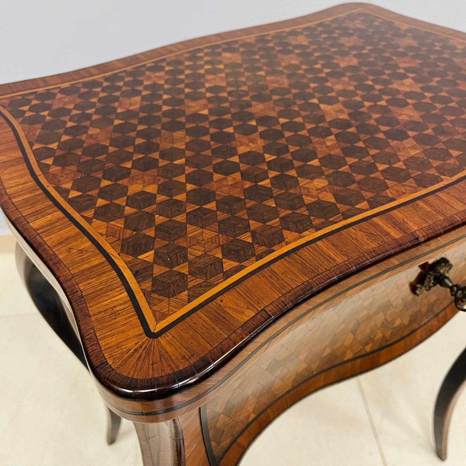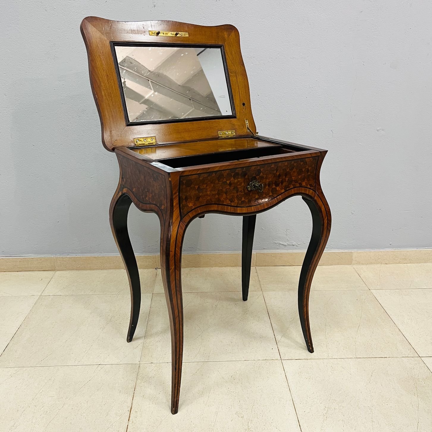 Mesa costurero francesa enchapada en palo de rosa con parqueterie en diferentes maderas. Tapa de volcar y un cajón con espejo en interior. Llave y bocallave en bronce, originales. 71 x 56 x 40 cm.