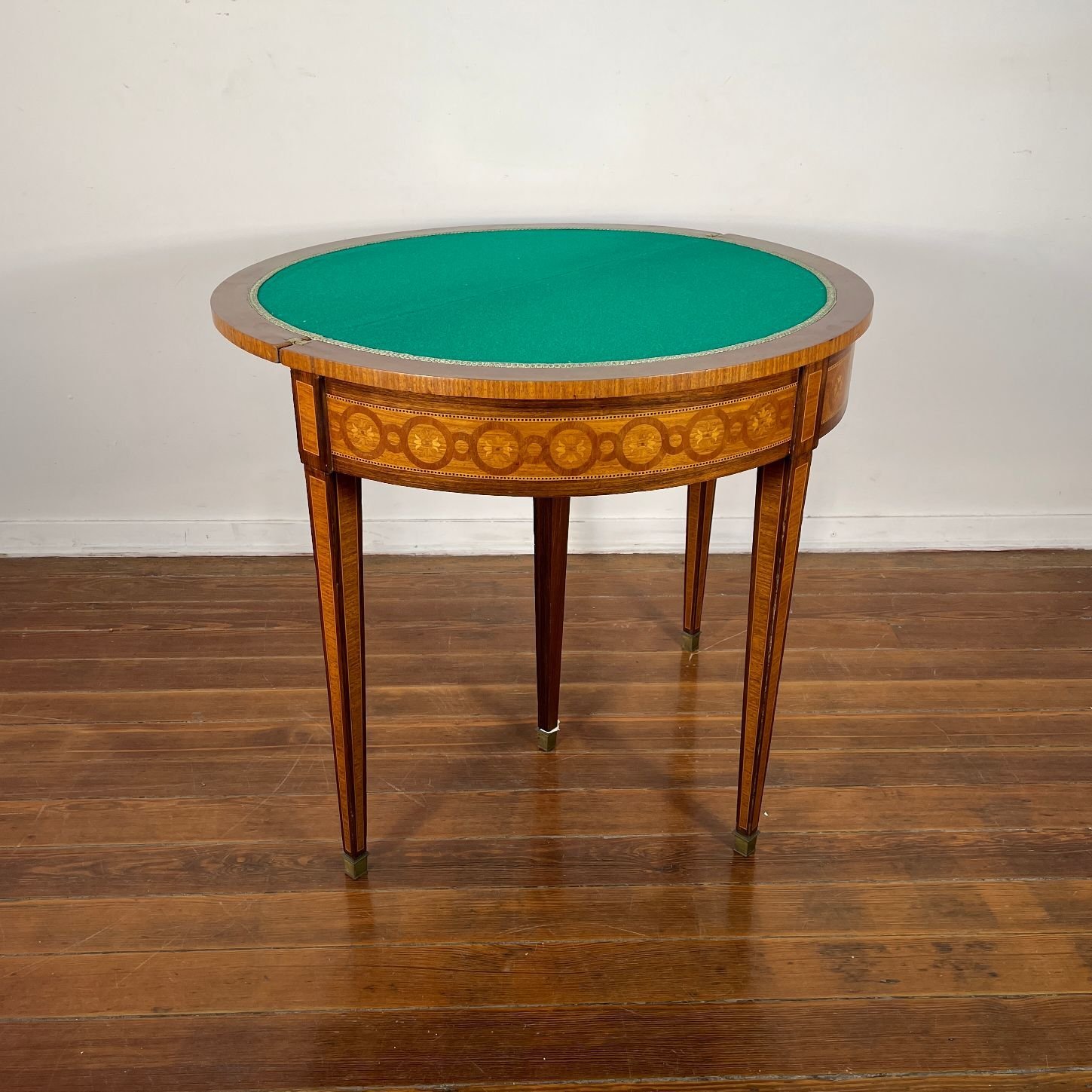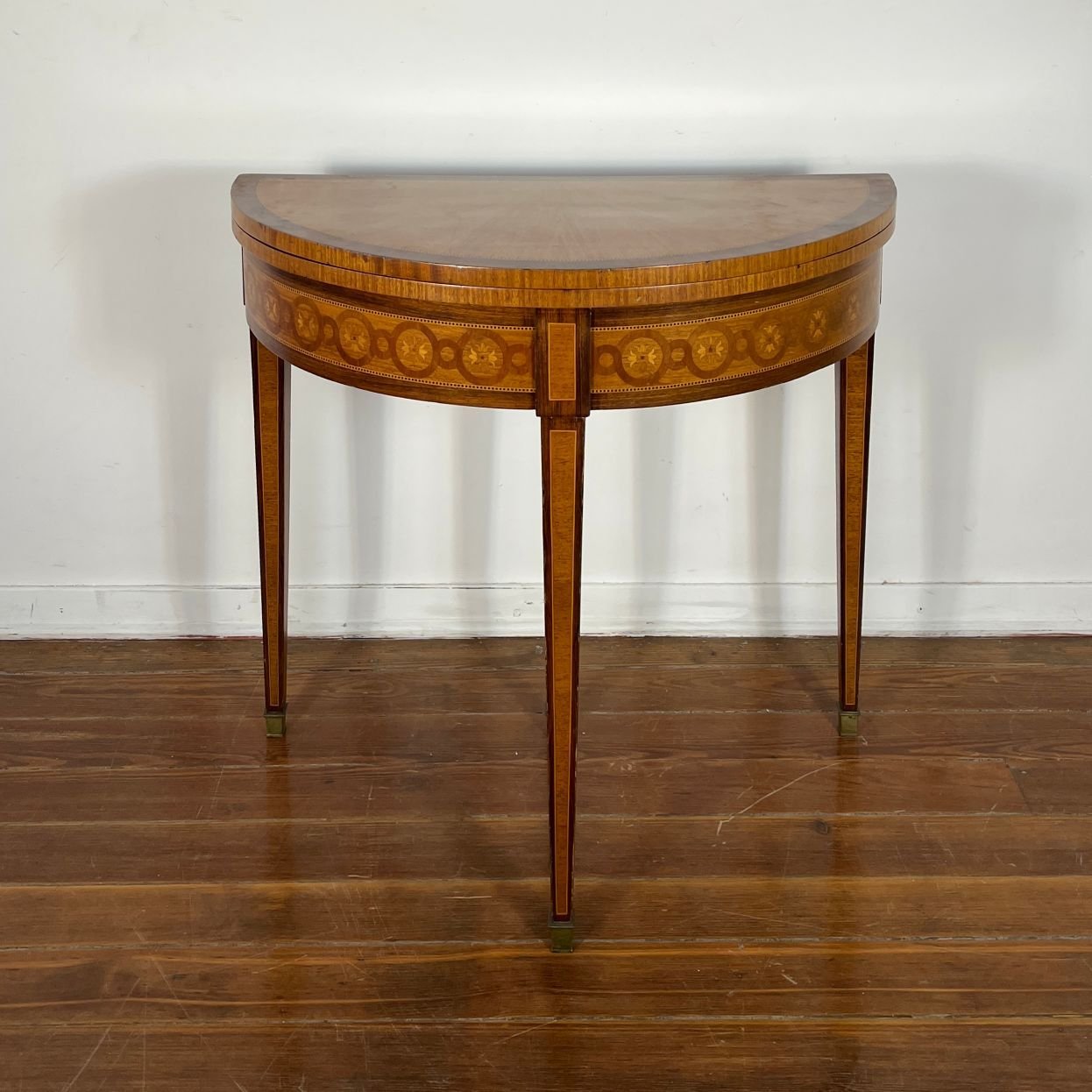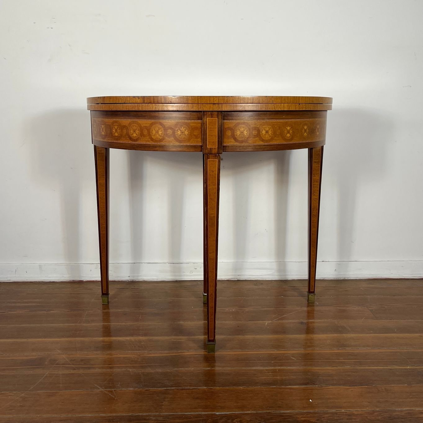 Mesa de arrimo inglesa estilo Adams, medio punto, con tapa libro, enchapada en diferentes maderas, con marqueterie floral y lineal. Regatones en bronce. 75 x 82 x 42 cm.