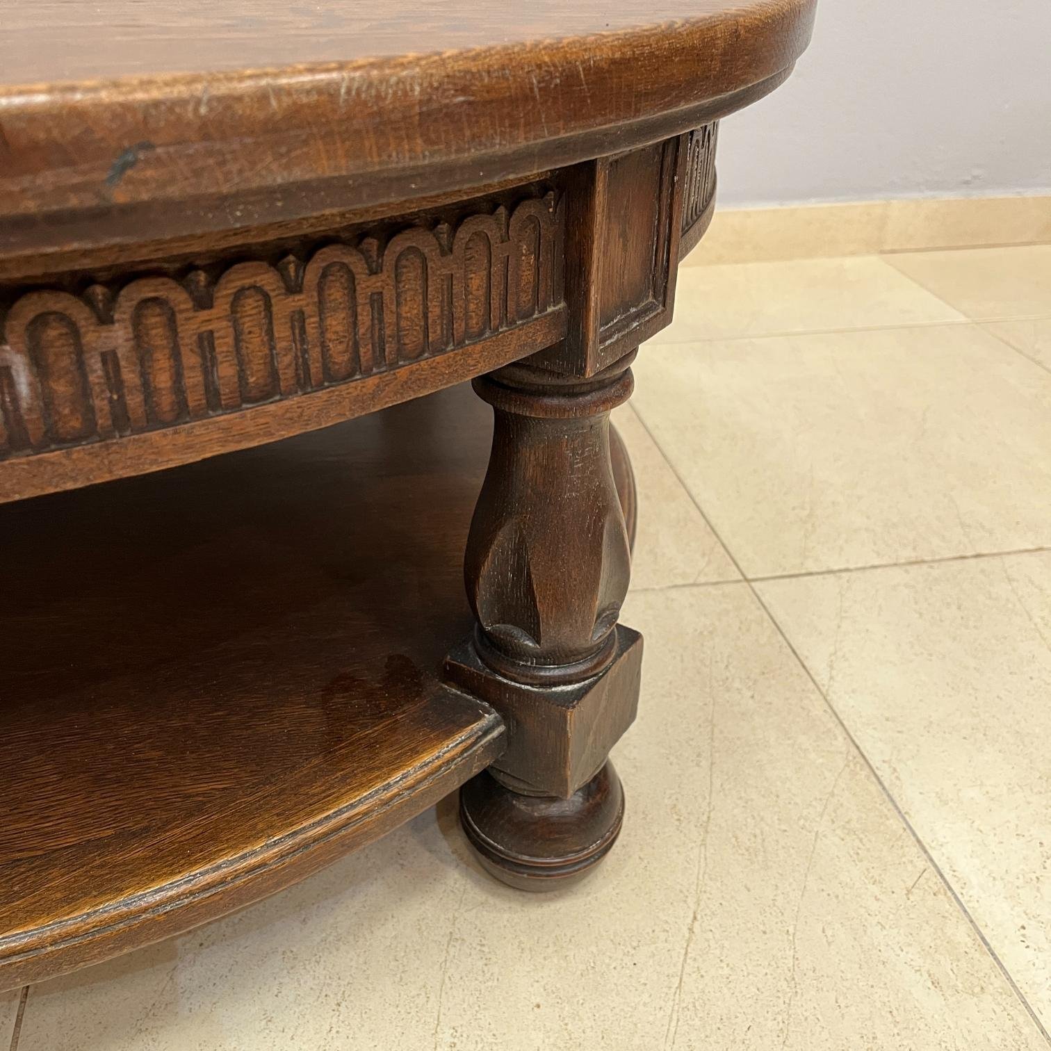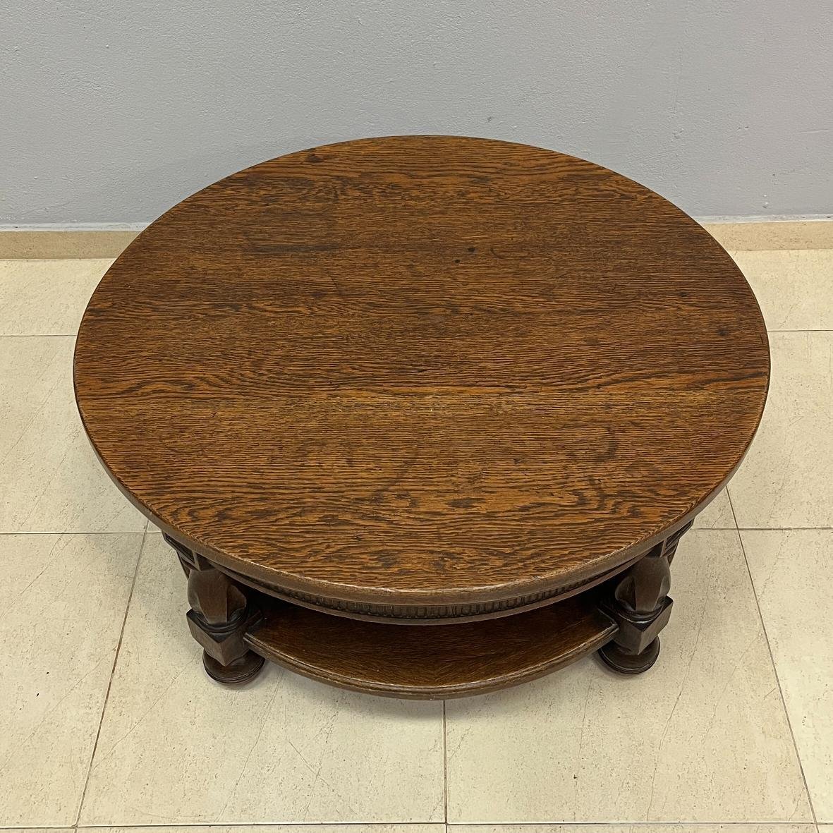Mesa de centro redonda inglesa estilo Tudor en madera de roble. Un estante y cuatro patas en forma de bocha. 41 x 87 cm.