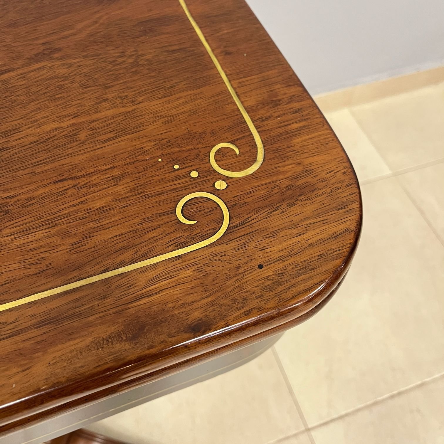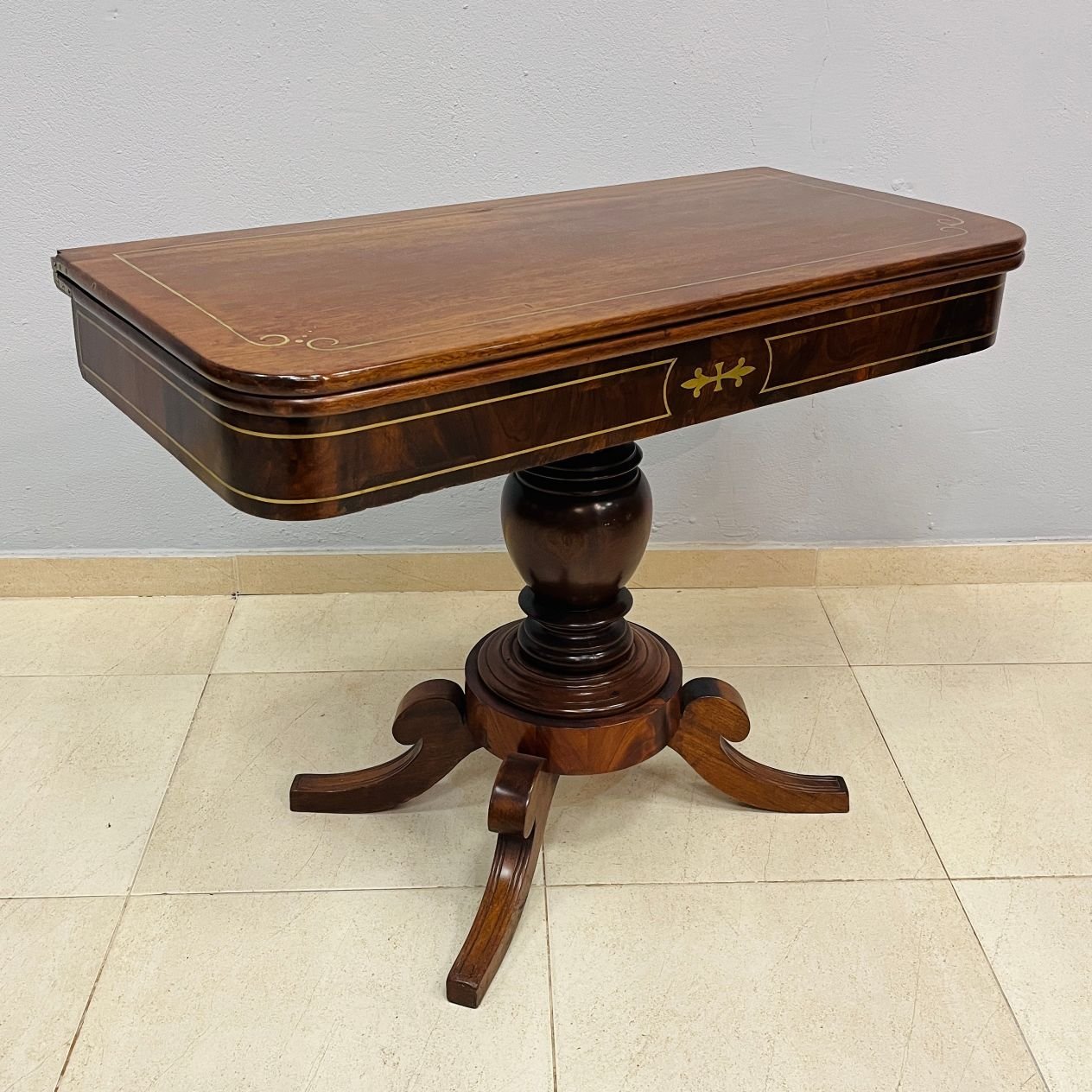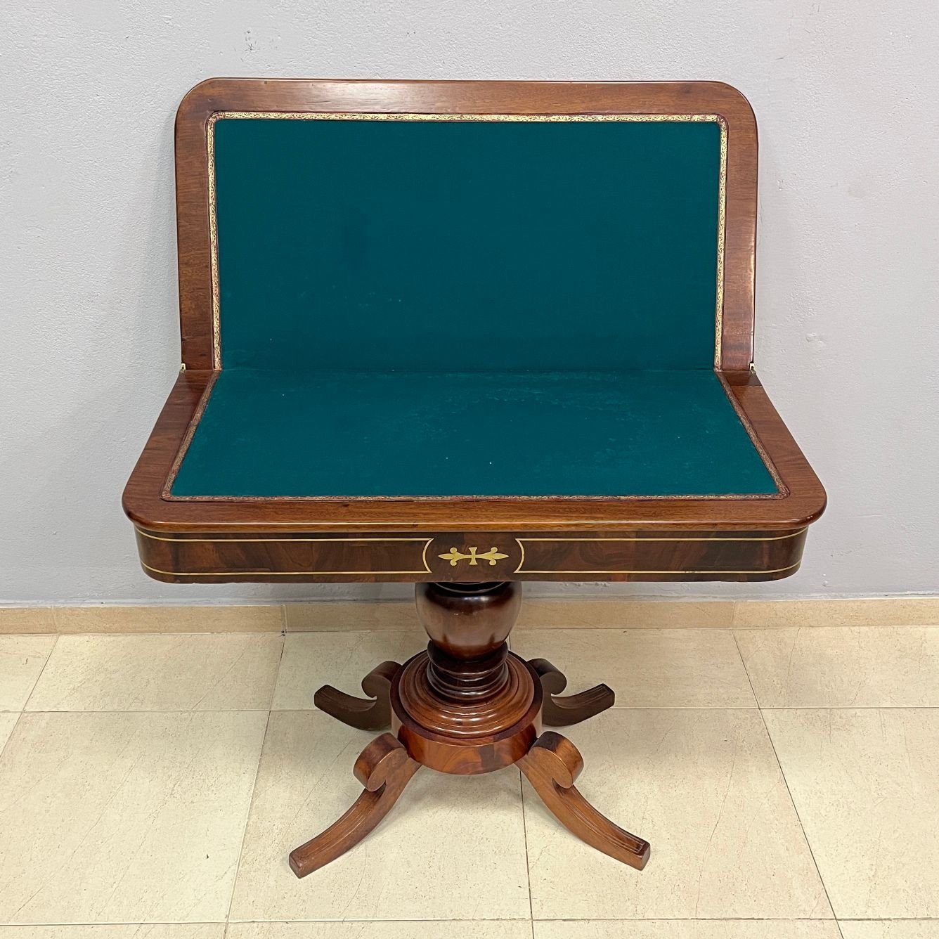 Mesa de juego inglesa en madera de caoba con aplicaciones en bronce. Tapa libro con interior forrado en paño verde con viñeta en cuero dorado y un pie con cuatro patas. 70 x 91 x 45 cm.