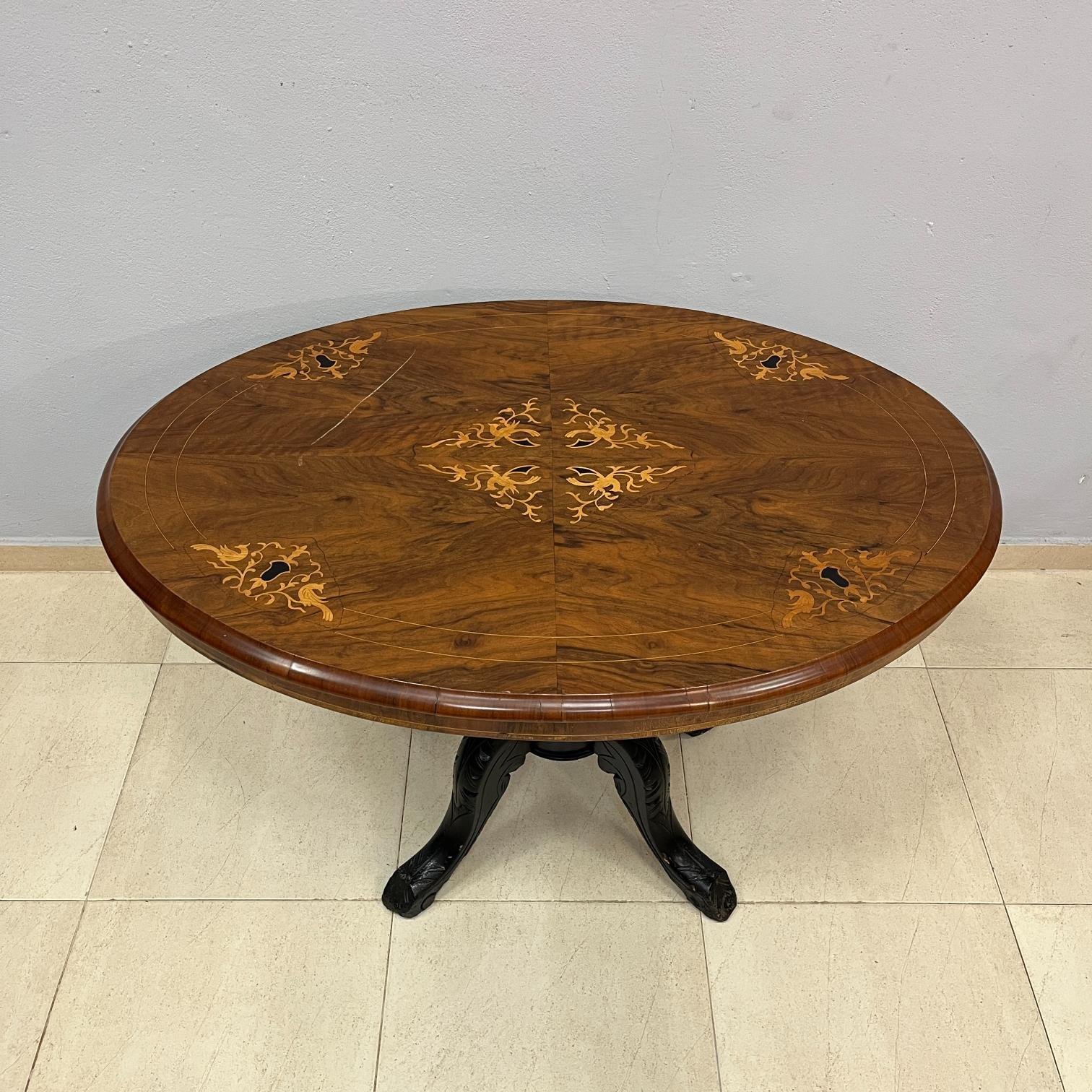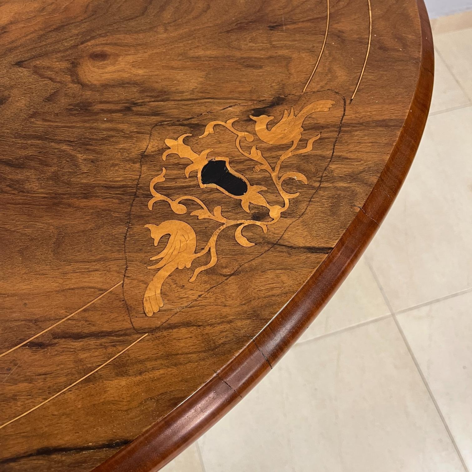 Mesa de sala inglesa, oval. Tapa enchapada en pluma de caoba con marqueterie floral en diferentes maderas. Pie de cuatro patas en madera ebanizada. 70 x 105 x 77 cm.