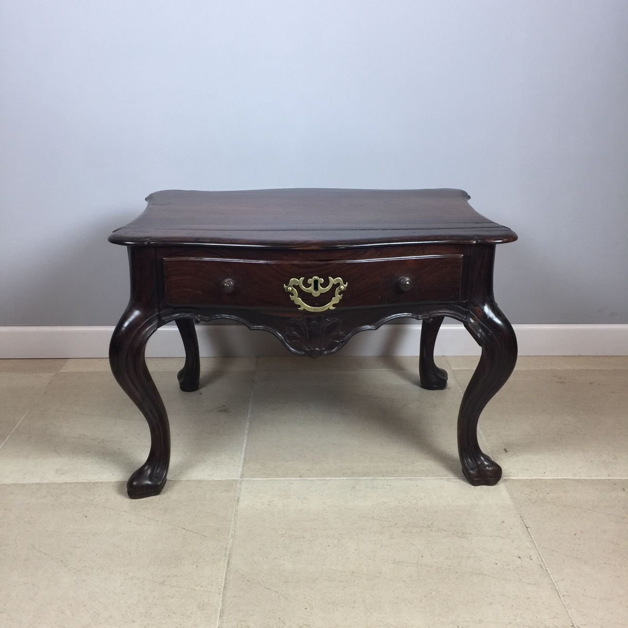 Mesa de estrado lusobrasileña s. XVIII estilo Dom José en madera de jacarandá tarugada y tallada «valvas». Un cajón con tiradores en madera. 44 x 64 x 48 cm. Falta cerradura. Antiguas restauraciones.