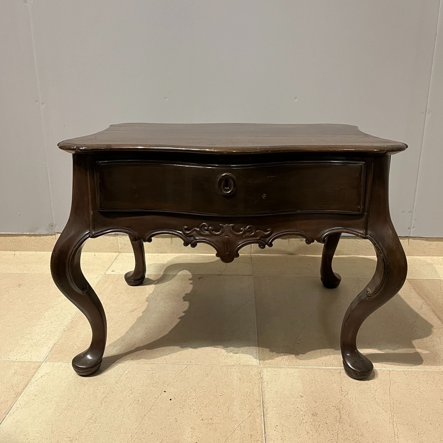 Mesa de estrado o «matera» lusobrasileña s. XVIII estilo João V en madera tarugada. Un cajón y laterales tallados. 47 x 67 x 48 cm.