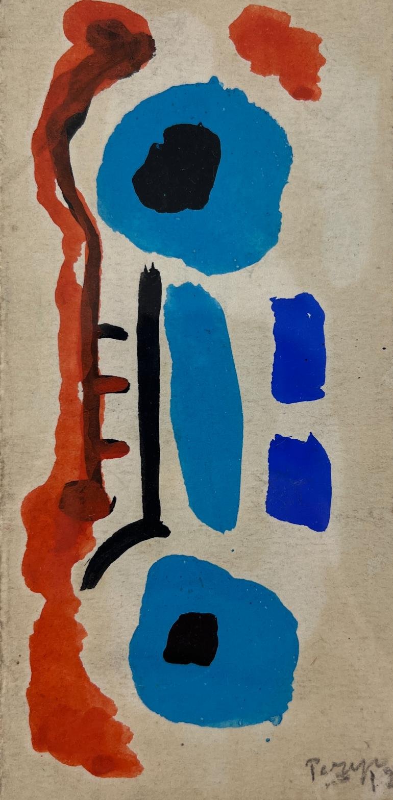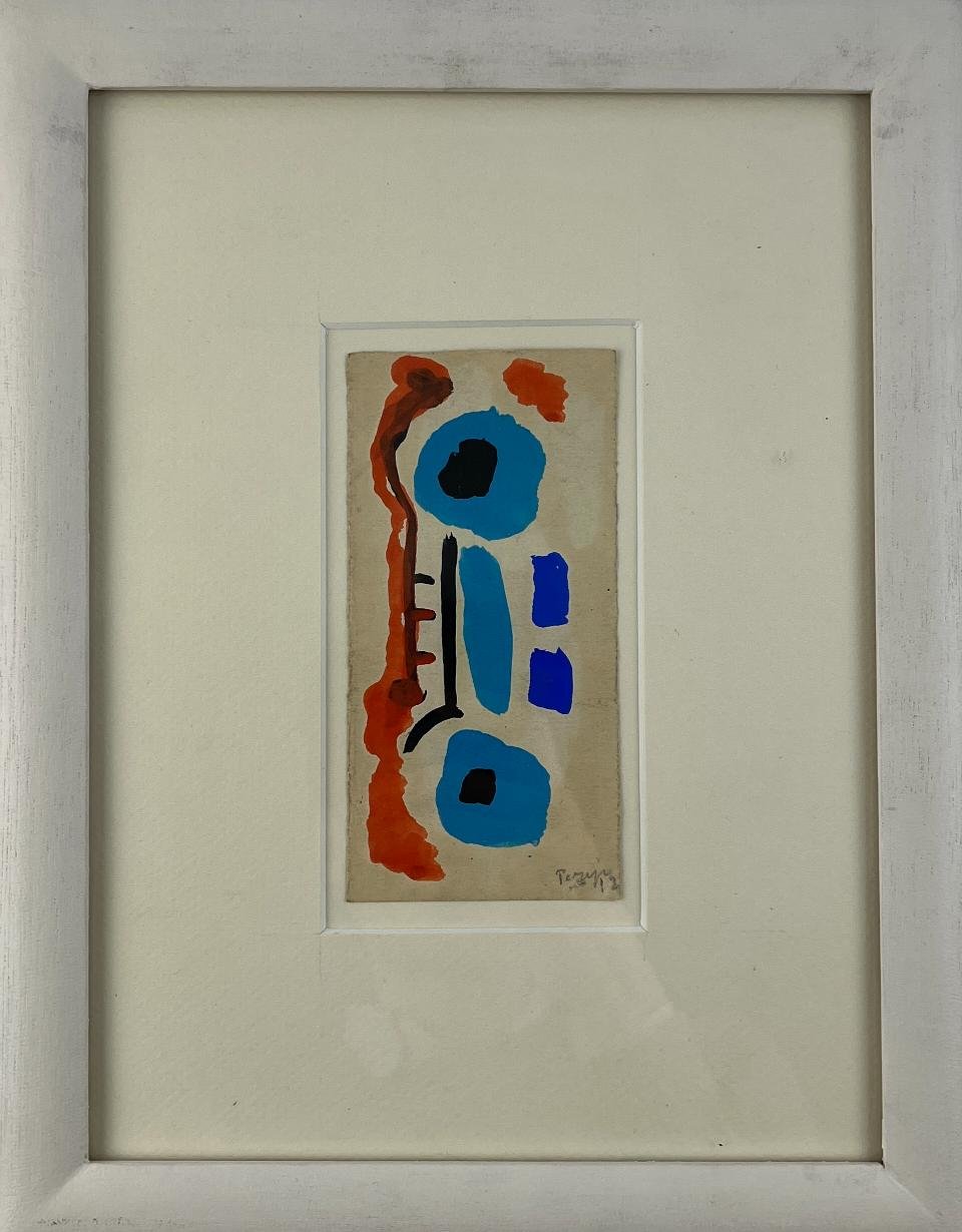 MIGUEL ÁNGEL PAREJA (Escuela uruguaya, 1908-1984) Acuarela sobre cartulina «Formas en anaranjado y celeste» Firmado y fechado «72» a lápiz abajo a la derecha 13,5 x 7 cm