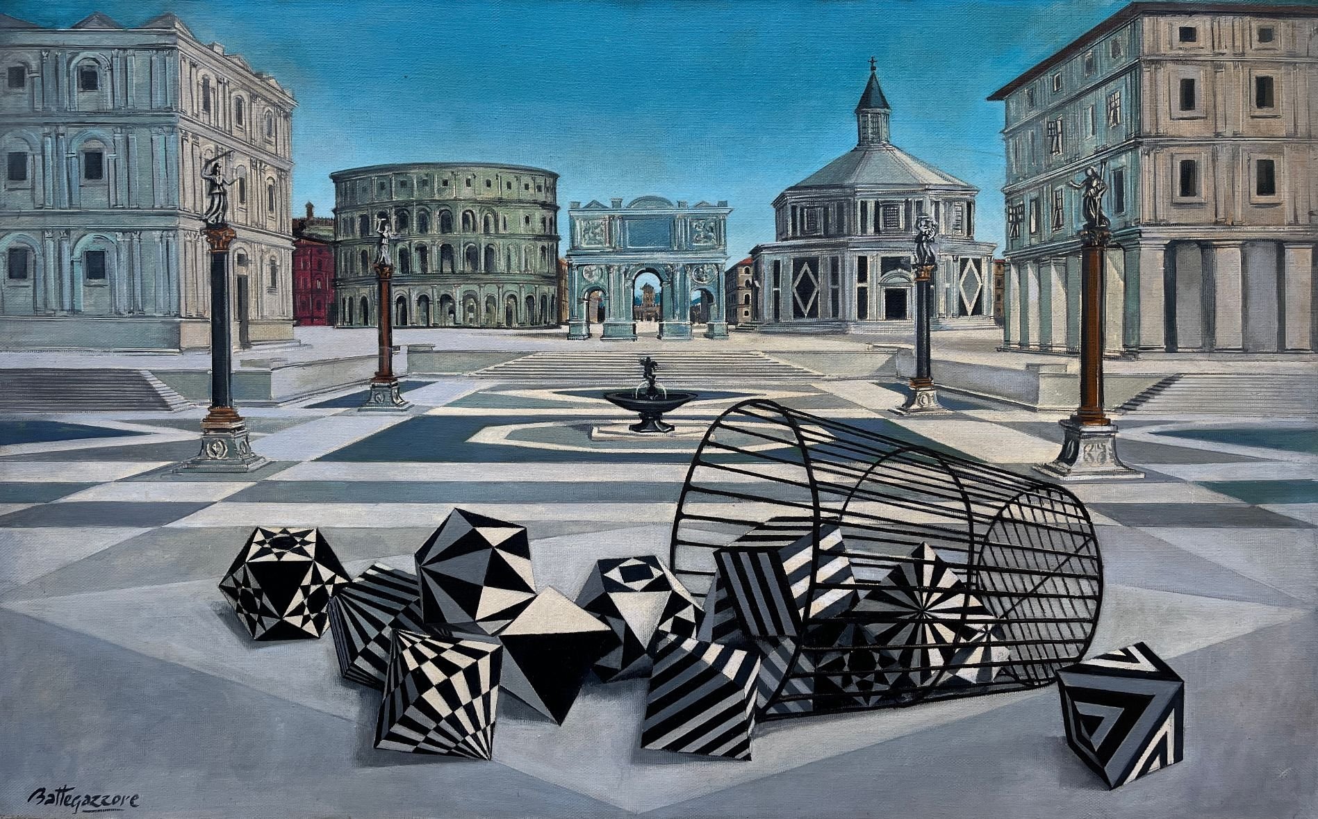 MIGUEL BATTEGAZZORE (1931) «Homenaje a Urbino II» Acrílico sobre tela Firmado abajo a la izquierda Al dorso titulado, medido y fechado «1983» por el artista 66.5 x 105 cm