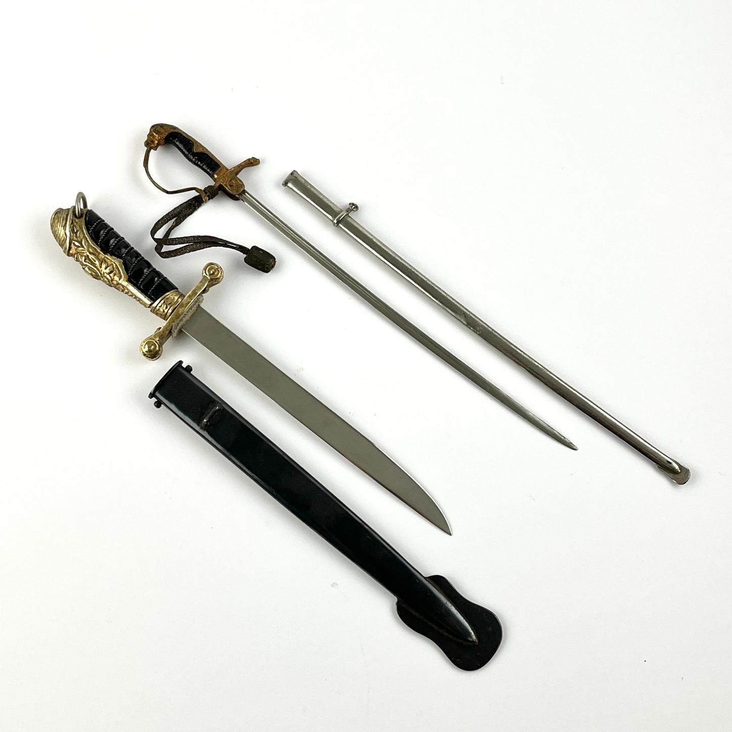 Conjunto de dos miniaturas: espadín de cadete de la Escuela Militar del Uruguay y sable uruguayo M1916.
