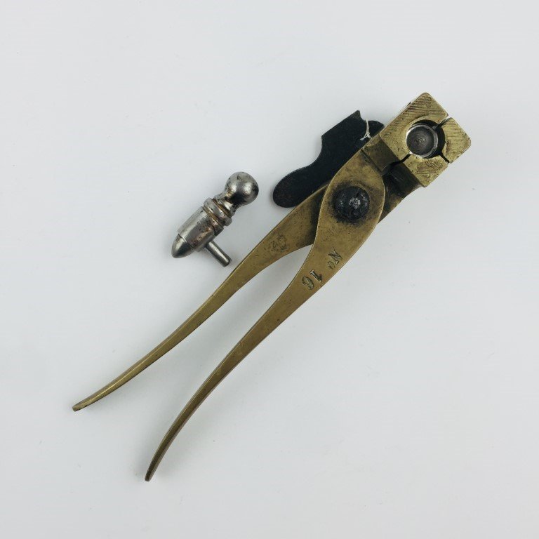 Pinza o molde para fabricar balas calibre 17, en bronce, numerada 16. Acompañada por pieza en hierro para realizar terminación de bala. Largo total 24 cm.