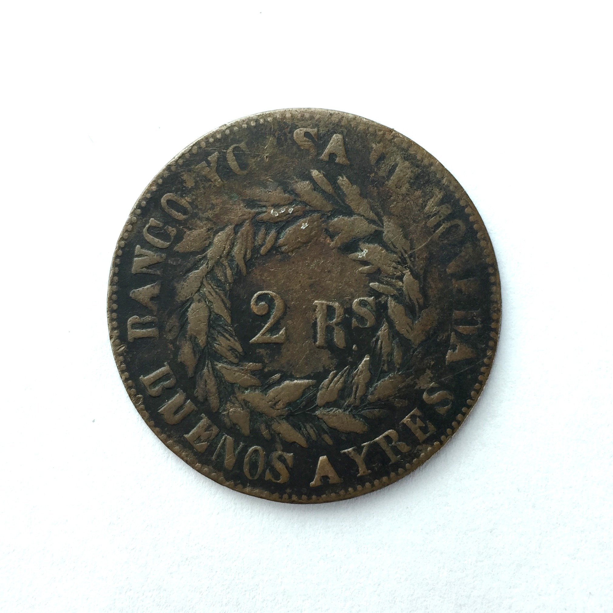 Moneda argentina en cobre año 1860 denominación 2 reales del Banco y Casa de la Moneda de Buenos Aires.
