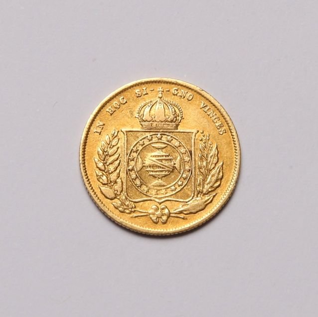 Moneda brasileña en oro época Pedro II denominación 5000 reis del año 1856. Diámetro 19.5 mm.