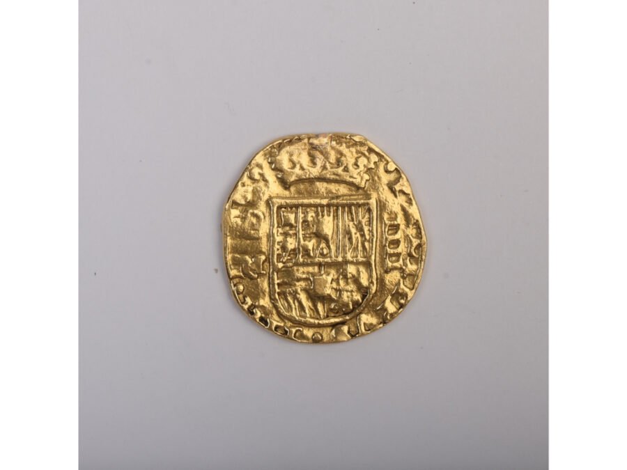 Moneda española en oro denominación 4 escudos, período Felipe IV (1621-1665), ceca Sevilla. Con resto de pequeña soldadura. Diámetro 28 mm. Peso 13.30 gr.