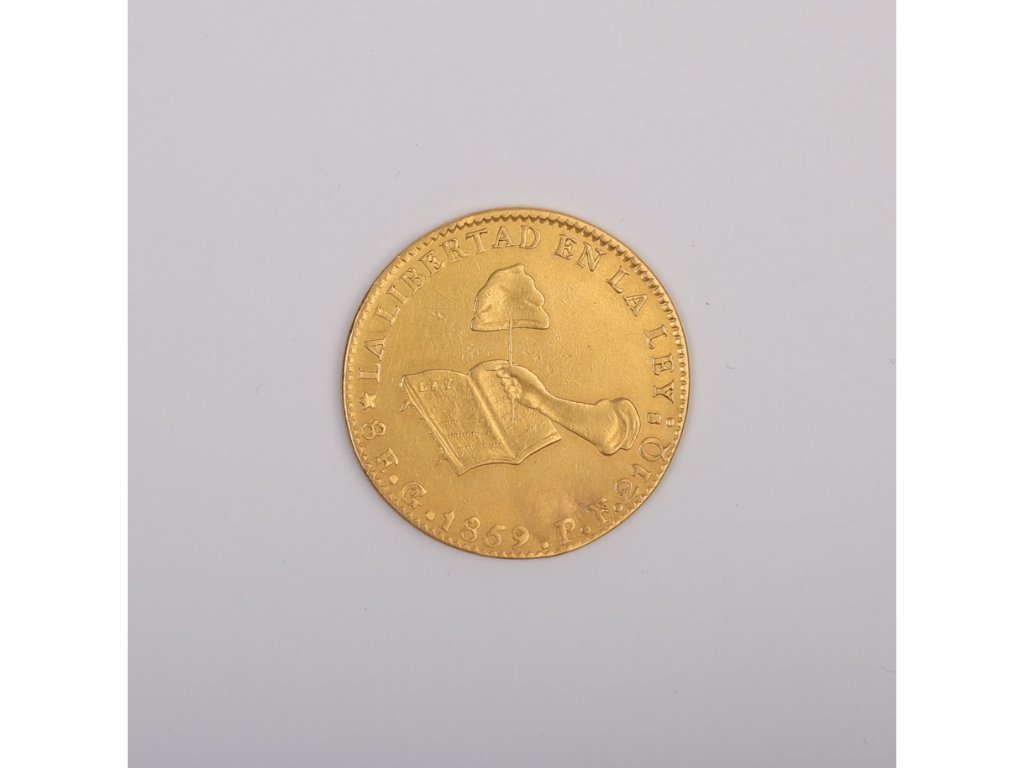 Moneda mexicana en oro denominación 8 escudos del año 1859. Peso 26.95 gr.