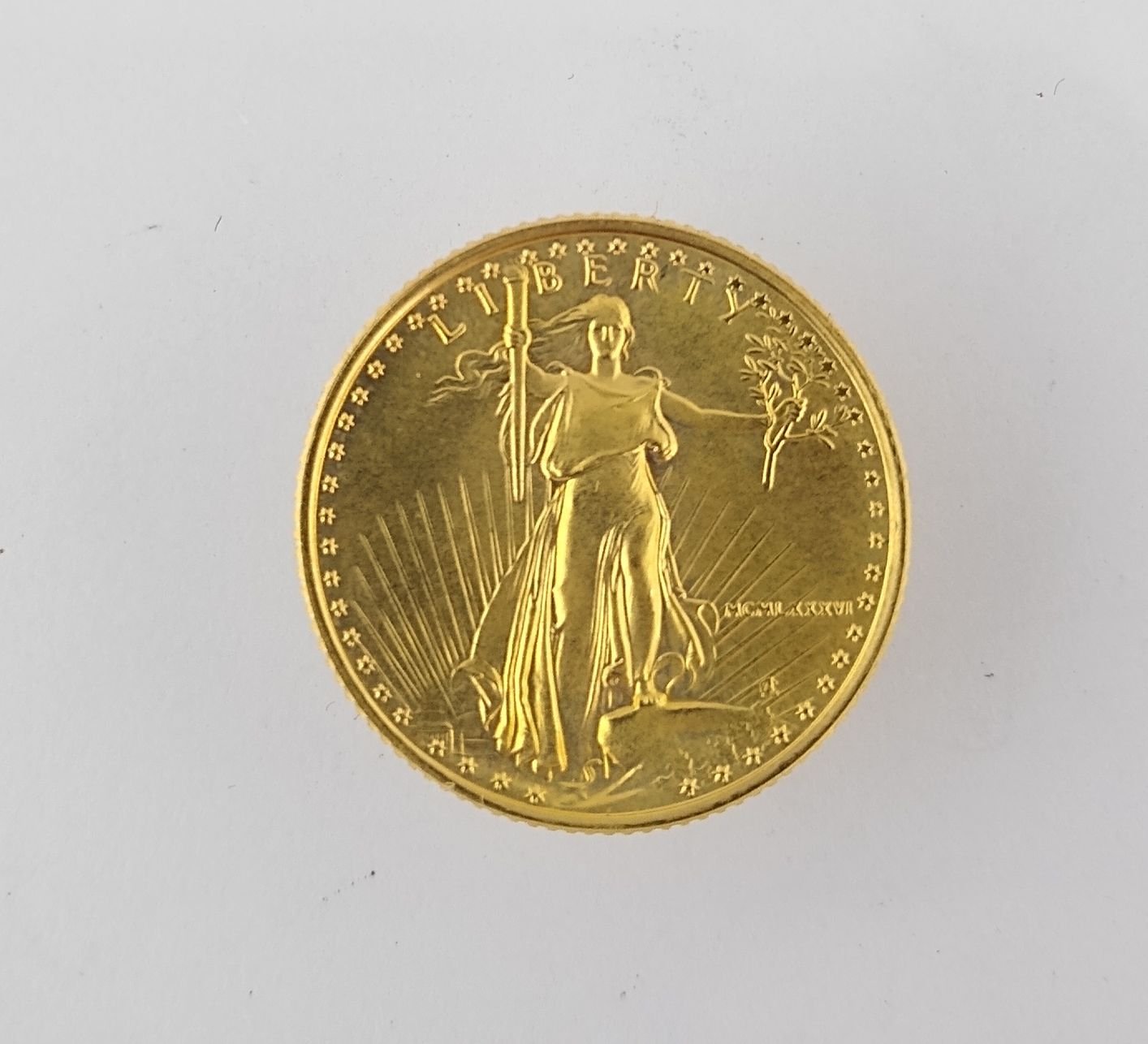 Moneda estadounidense en oro denominación 5 dólares. Diámetro 16 mm.
