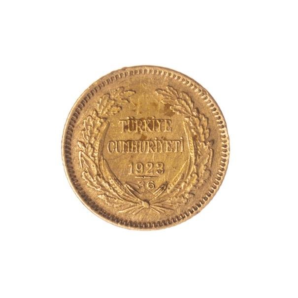 Moneda turca en oro denominación 25 kurus del año 1959. Diámetro 1,47 mm. Peso 1,75 gr.