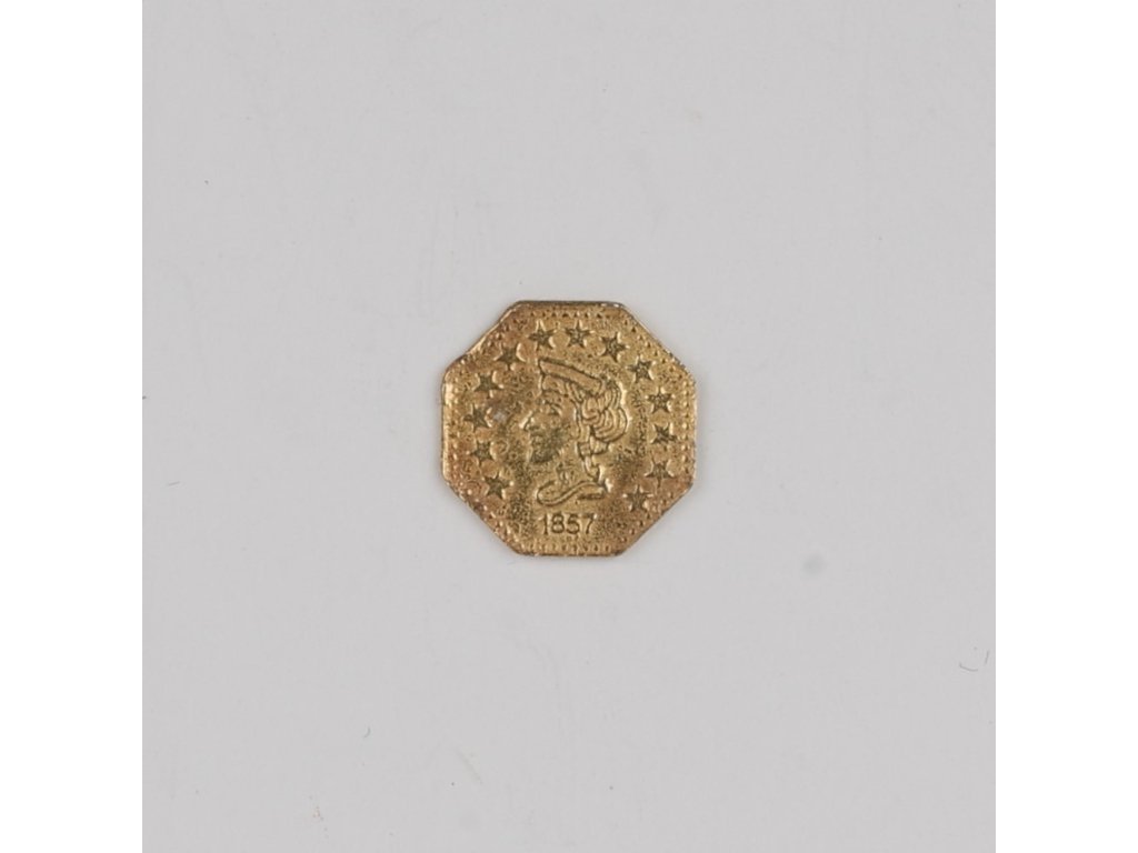 Moneda estadounidense en oro, hexagonal, del estado de California, denominación 1/2 dólar del año 1857. Peso 0.41 gr.