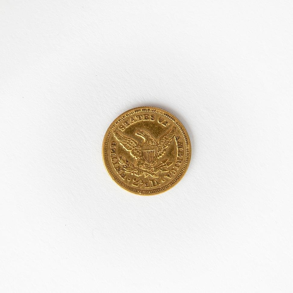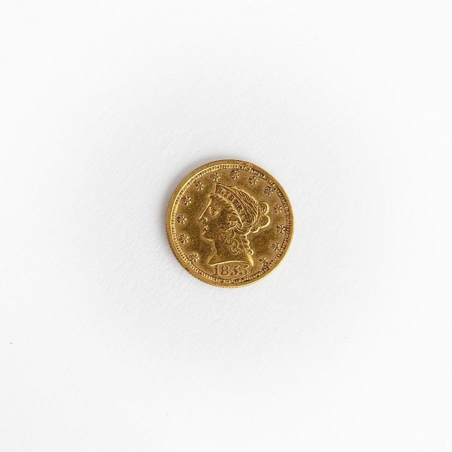 Moneda estadounidense en oro denominación 2 dólares y medio del año 1855. Diámetro 18 mm. Peso 4.16 gr.