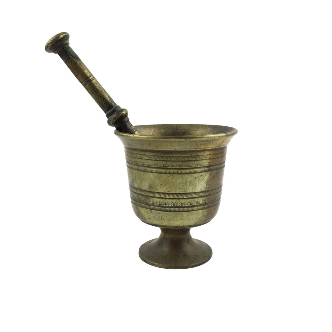 Mortero en bronce con guarda cincelada «hojas», con mano. 12 x 11 cm.