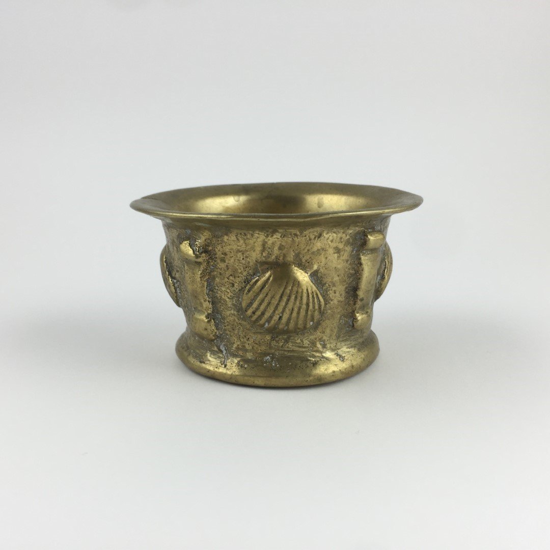Pequeño mortero en bronce fundido decorado «valvas». 5.5 x 9.5 cm.