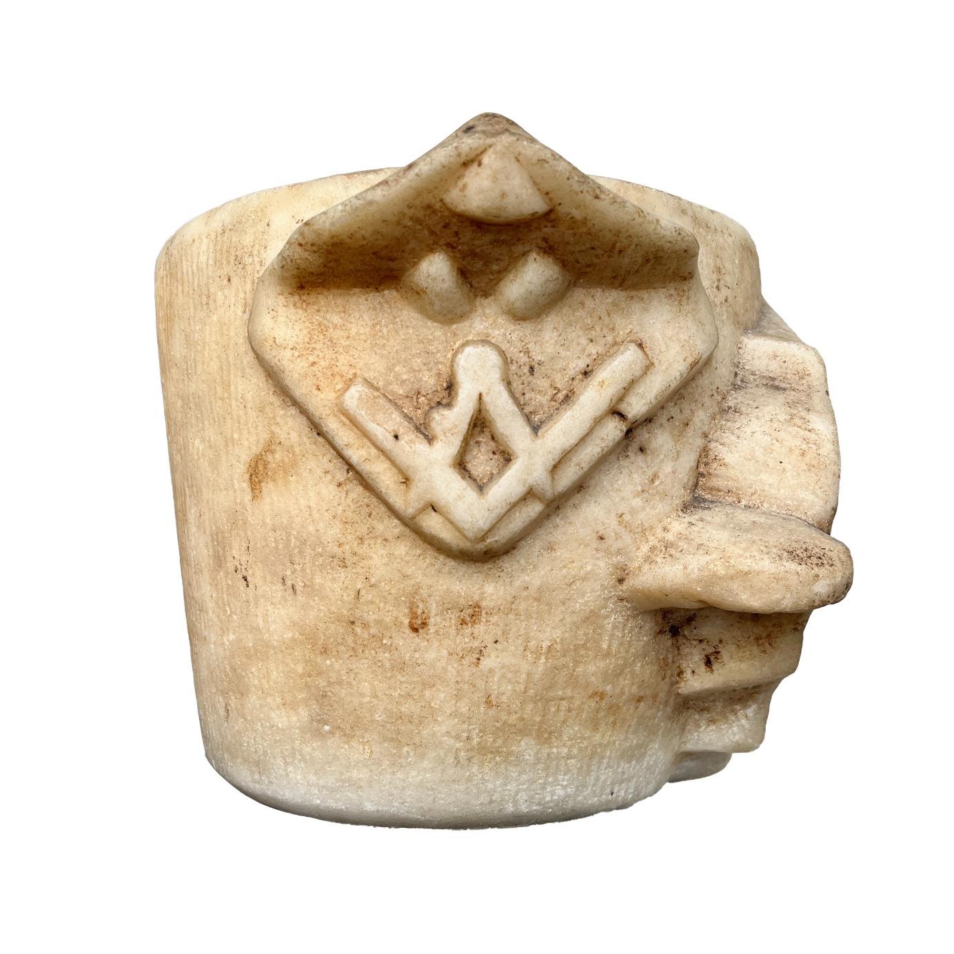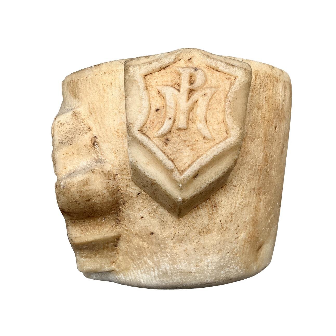 Mortero en alabastro, tallado con leyenda «1897» flanqueada por dos lanzas con banderolas revolucionarias, relativas a la revolución liderada por Aparicio Saravia en Uruguay en el año 1897, con laterales tallados con marca de estancia y escuadra y compás masónicos. 15 x 25 x 20 cm. Con mano en alabastro tallado.