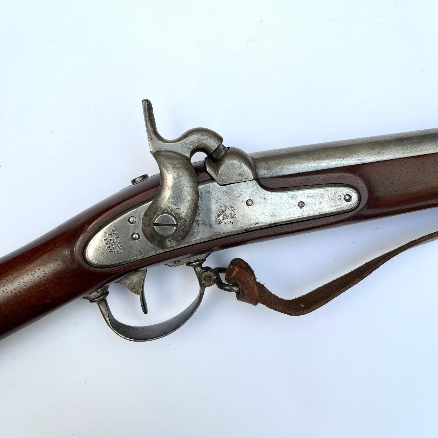 Mosquetón de avancarga, sistema de percusión, fabricado en Italia por Armi Sport, Chiappa, calibre .69, réplica funcional para pólvora negra del fusil estadounidense de la Guerra de la Secesión, Springfield modelo 1847. Con baqueta, correa, bayoneta de cubo y dos moldes marca Lee, EEUU, para proyectil esférico y ojival. Largo total 148 cm. Funcionando.
