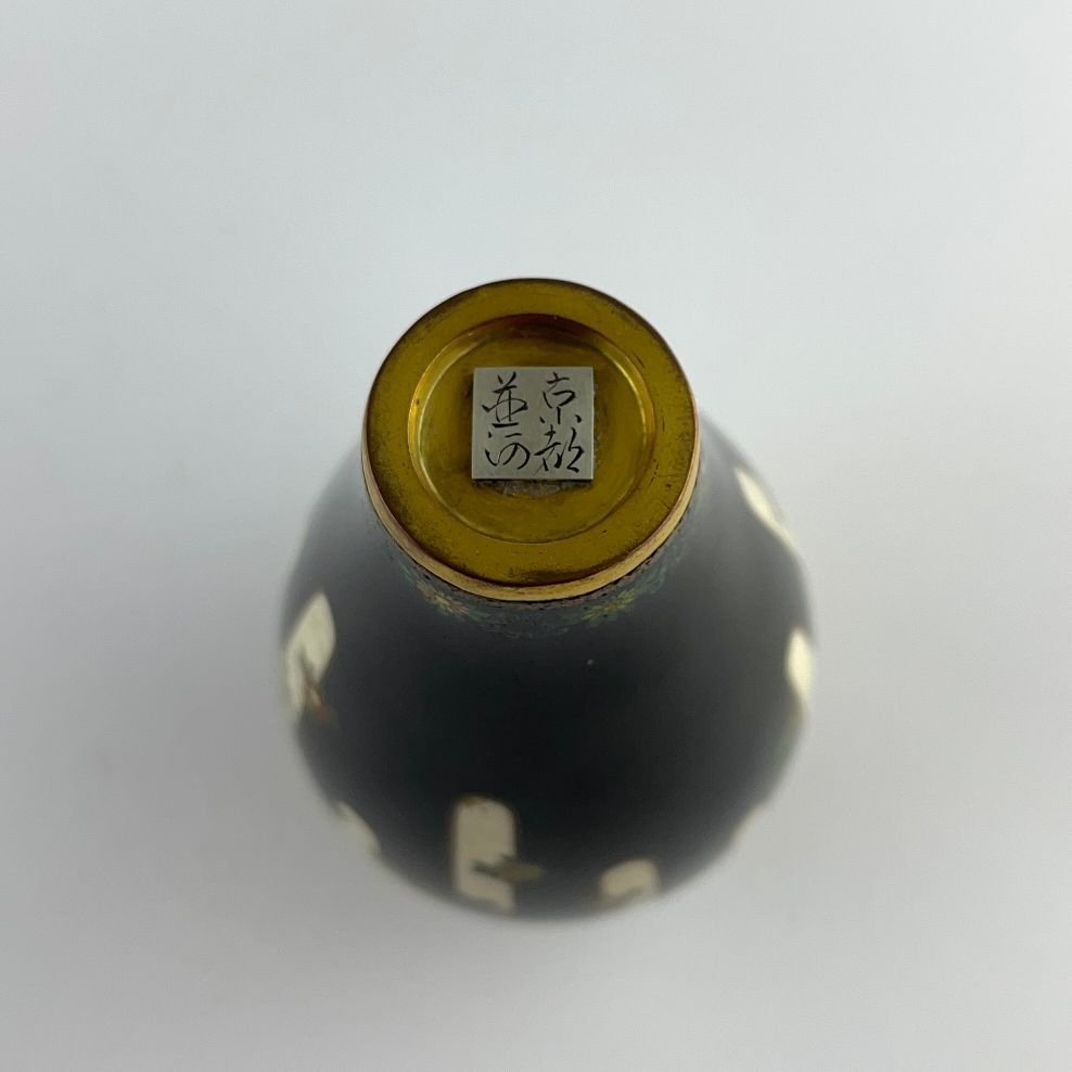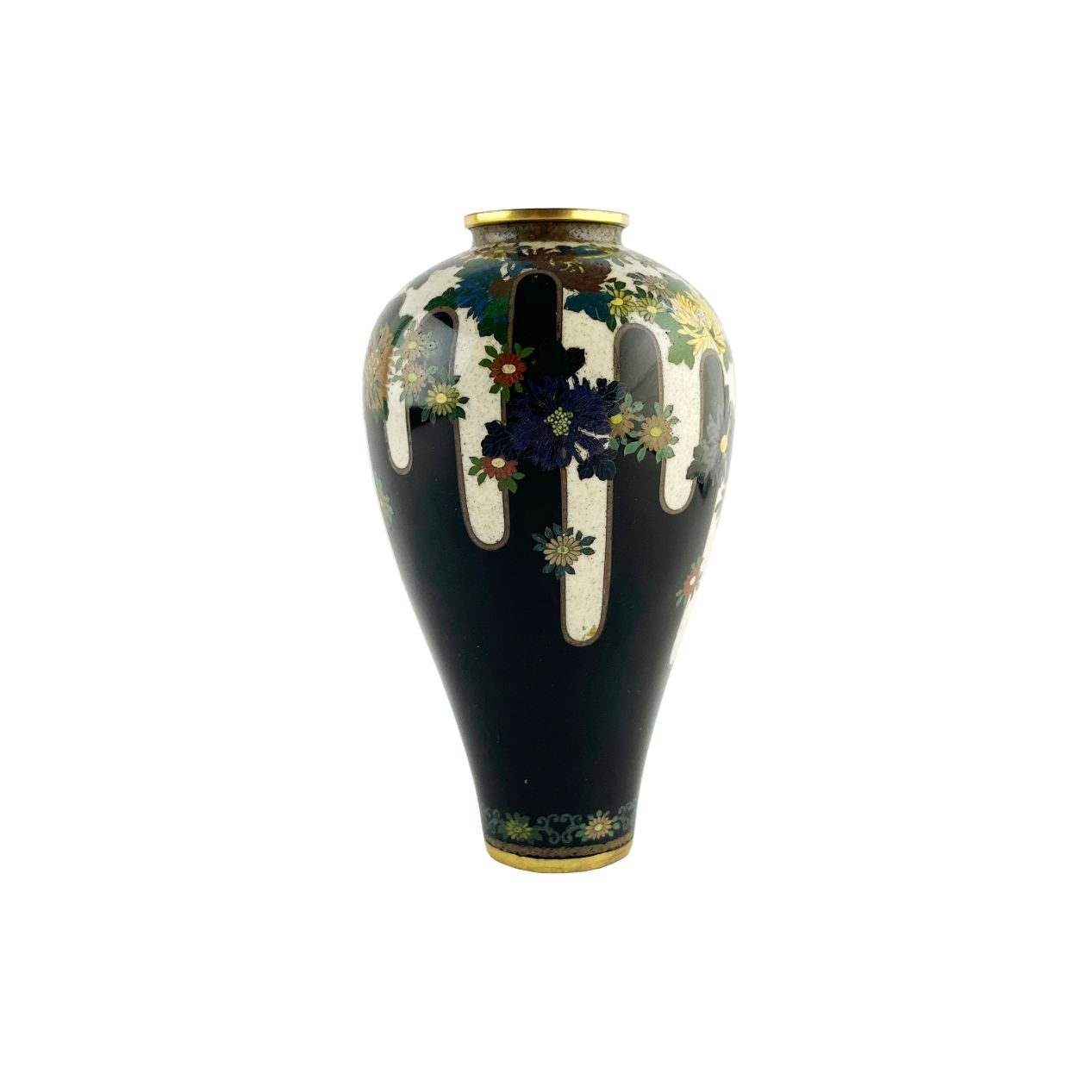 NAMIKAWA YASUYUKI (escuela japonesa, 1845–1927). Florero japonés en bronce cloisonné decorado «crisantemos» en varios colores sobre fondo negro y blanco. Período Meji. Firmado en la base sobre placa en plata. 10 x 6 cm.