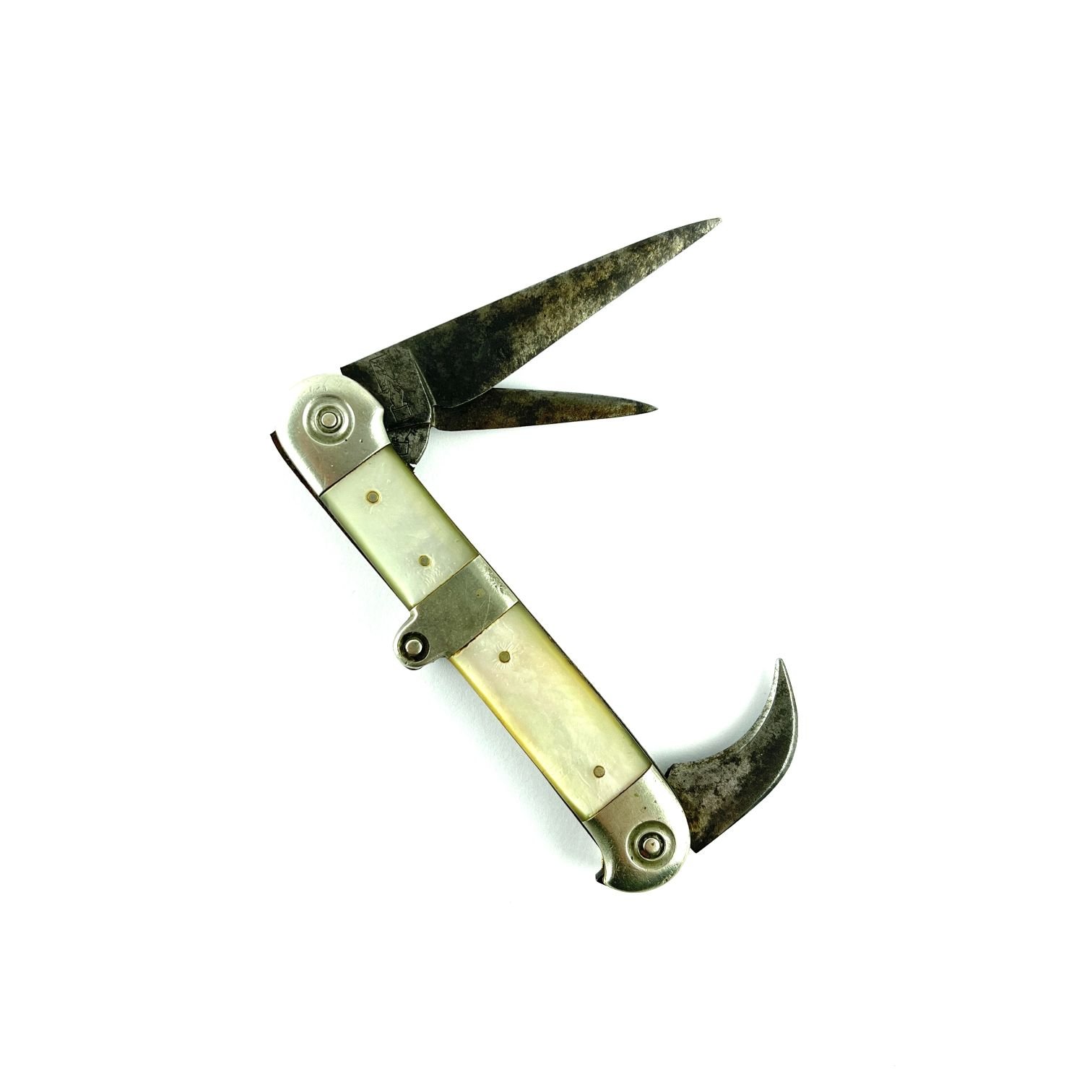 Navaja alemana «El Correo», Solingen. Tres accesorios. Cachas en alpaca y nácar. Largo cerrado 9.5 cm.